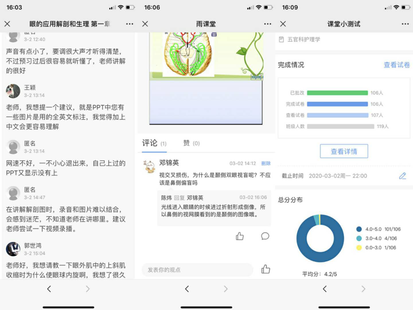 外科护理学教研室的《外科护理学》《眼耳鼻咽喉口腔科护理学》运用了学校雨课堂平台,采用“PPT课件+配音”方式,事先发布预习资料,要求学生带着问题来学习,开通在线答疑,对学生上课期间遇到的问题,及时回复。