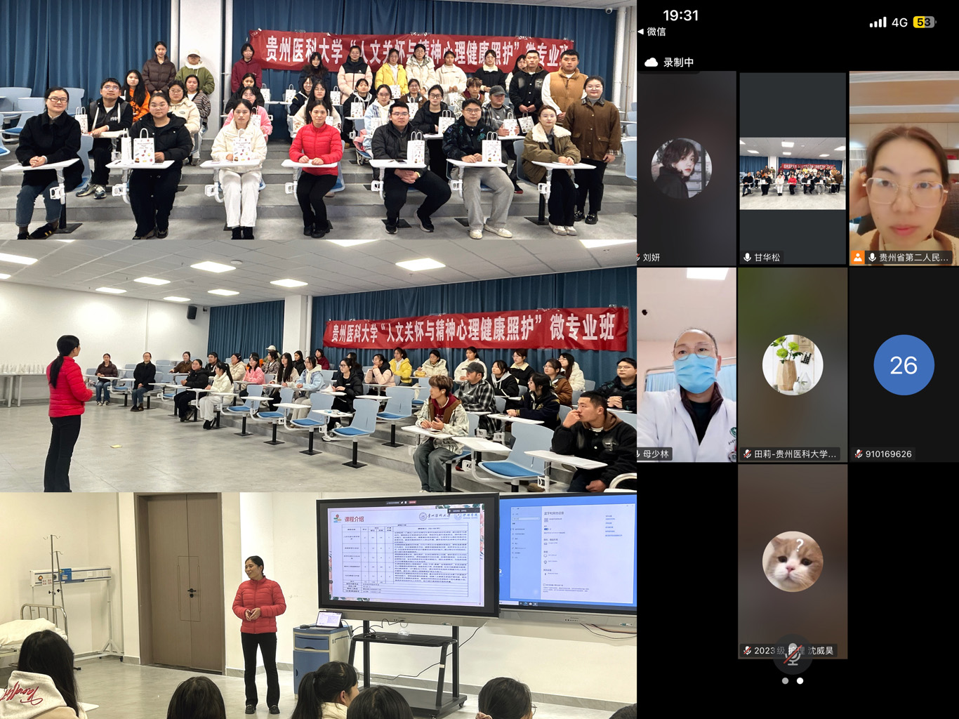 为积极响应国家加强精神卫生服务体系建设的号召,适应新时代精神健康服务需求,培养兼具专业技能与人文关怀素养的健康照护人才,allwincity万象城官方网站开设的“人文关怀与精神心理健康照护”微专业于11月3日在云漫湖校区临床组团酬勤楼示教室举行了开课仪式。开课仪式采用线上线下相结合的方式进行。护理人文教研室主任张仁莉,教师李红、刘妍以及allwincity万象城官方网站附属医院心理精神科护士长田莉、精神专科护士母少林和甘华松、贵州省第二人民医院康复科主任刘义、课程秘书覃启柔等微专业团队老师以及32名微专业学员共同参与。