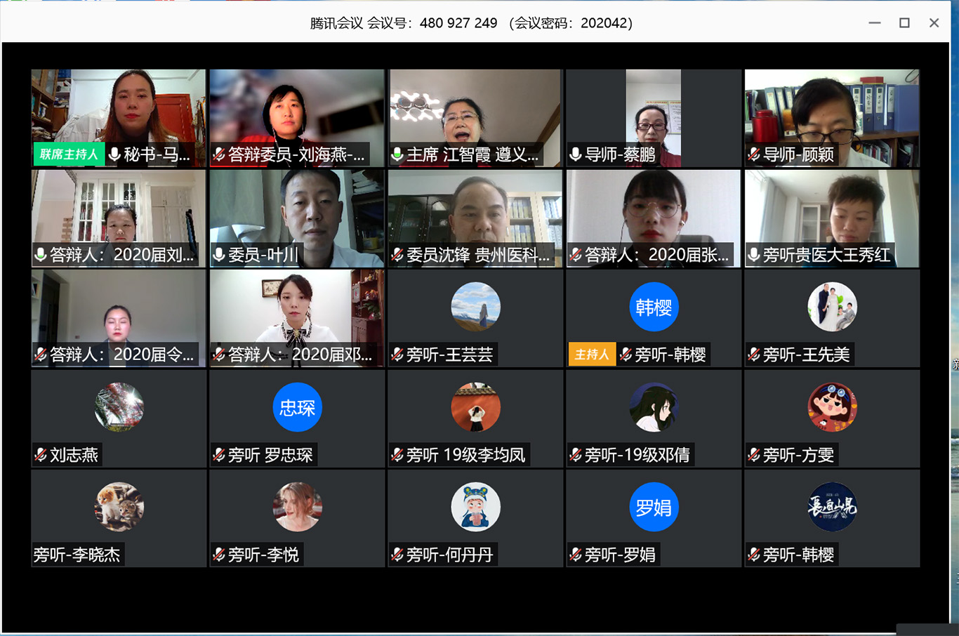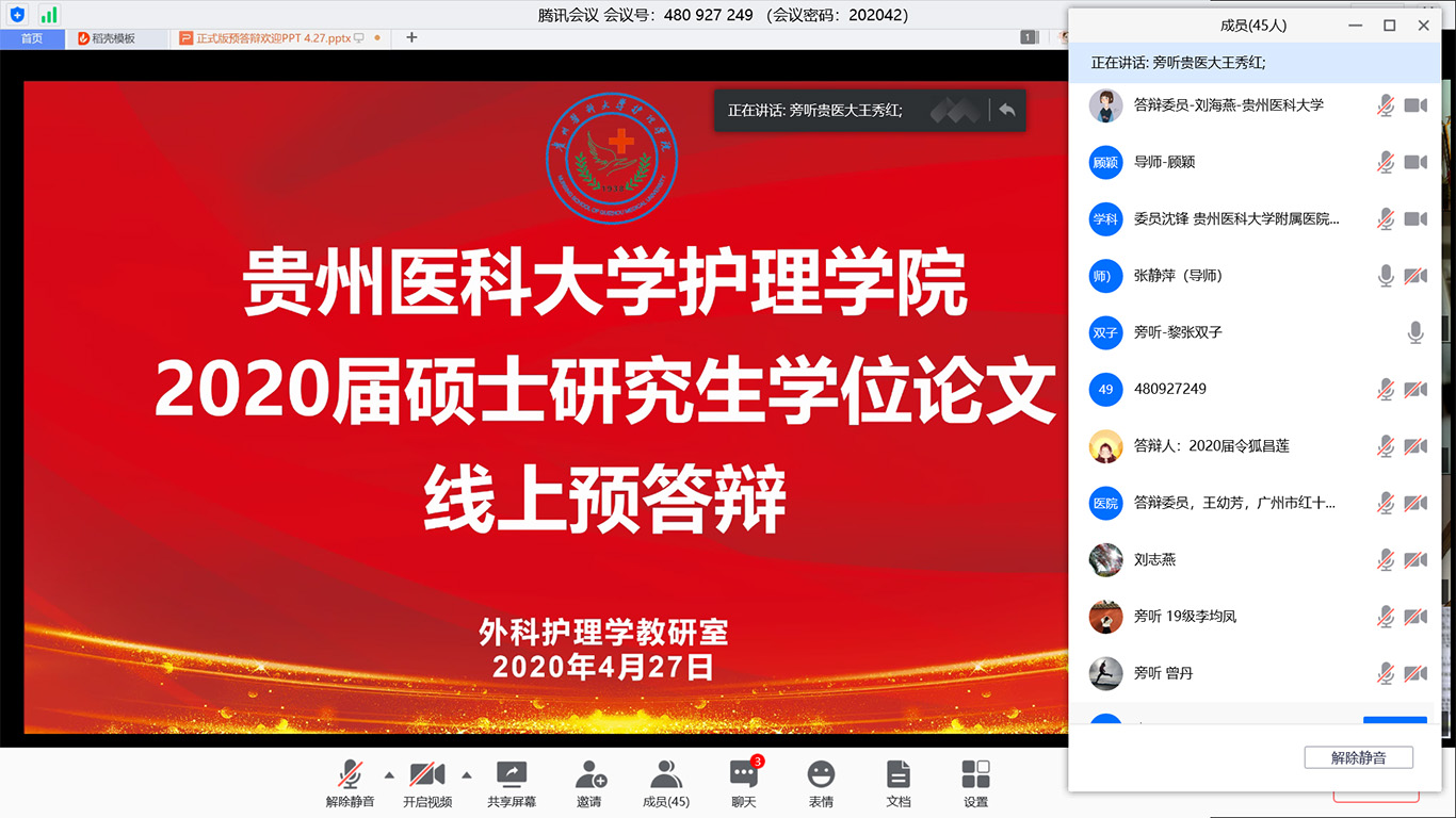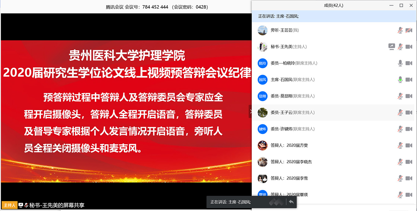 此次线上预答辩采用腾讯会议平台,8名毕业班研究生同学按研究方向分成两组进行。答辩委员会主席和委员分别由贵州中医药大学allwincity万象城官方网站党委书记石国凤教授、遵义医科大学allwincity万象城官方网站院长江智霞教授、贵州省人民医院柏晓玲博士、allwincity万象城官方网站附属医院ICU主任沈锋博士、骨科博士后叶川教授、老年医学科教授莫显刚博士、广州红十字会医院王幼芳副主任护师、allwincity万象城官方网站公共卫生学院王子云博士、刘海燕副教授、allwincity万象城官方网站基础医学院许健炜博士担任。两场预答辩共有近100人参加,学校研究生教育督导专家、allwincity万象城官方网站及附院导师、专业教师和全体研究生同学参加预答辩旁听。