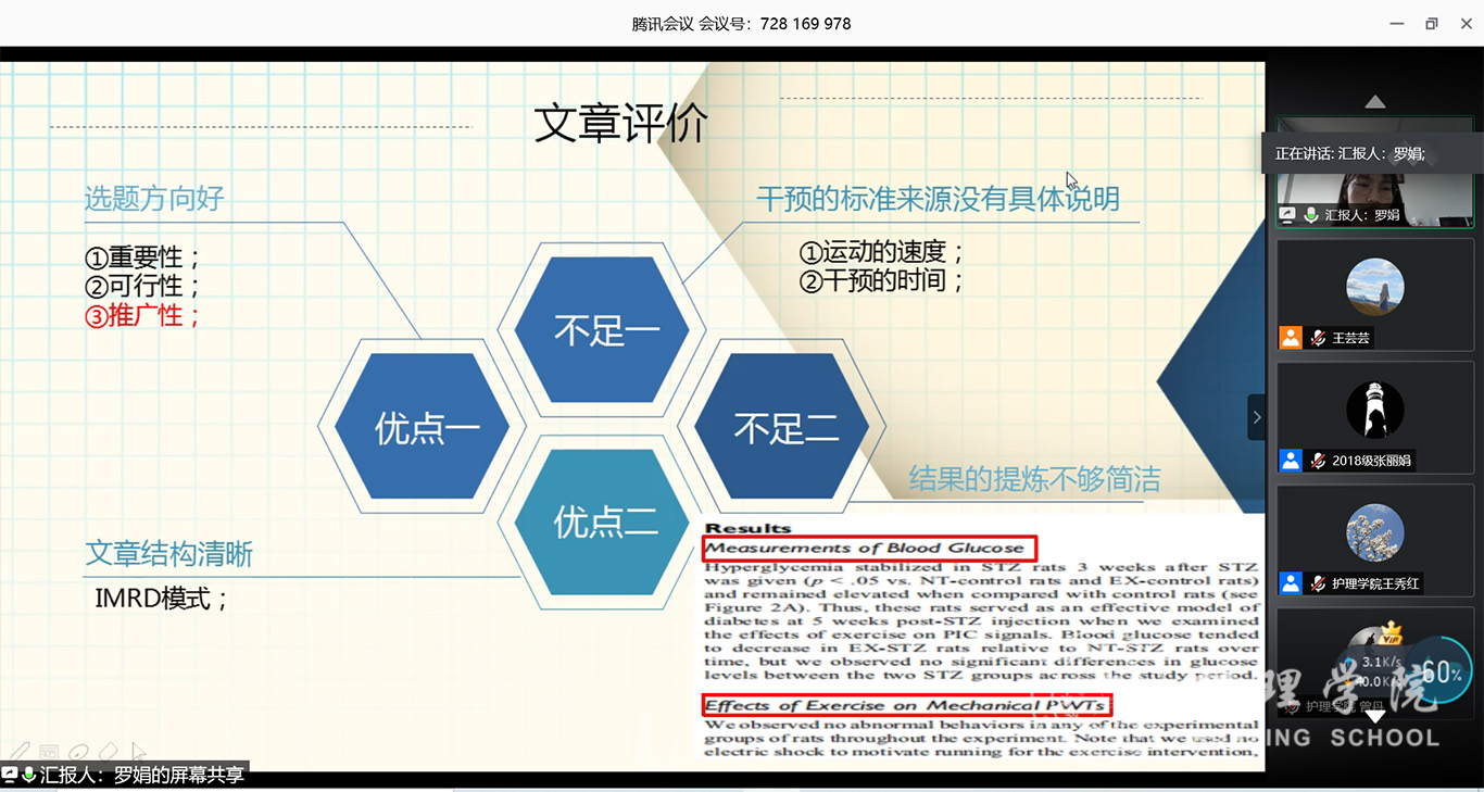 最后,导师们根据学生的综合表现进行线上面对面点评,同时通过问卷星发放读书报告评价表,对学生汇报内容就选择意义、内容掌握、延伸拓展等方面进行综合考评,作为研究生培养学术综合成绩评定参考。