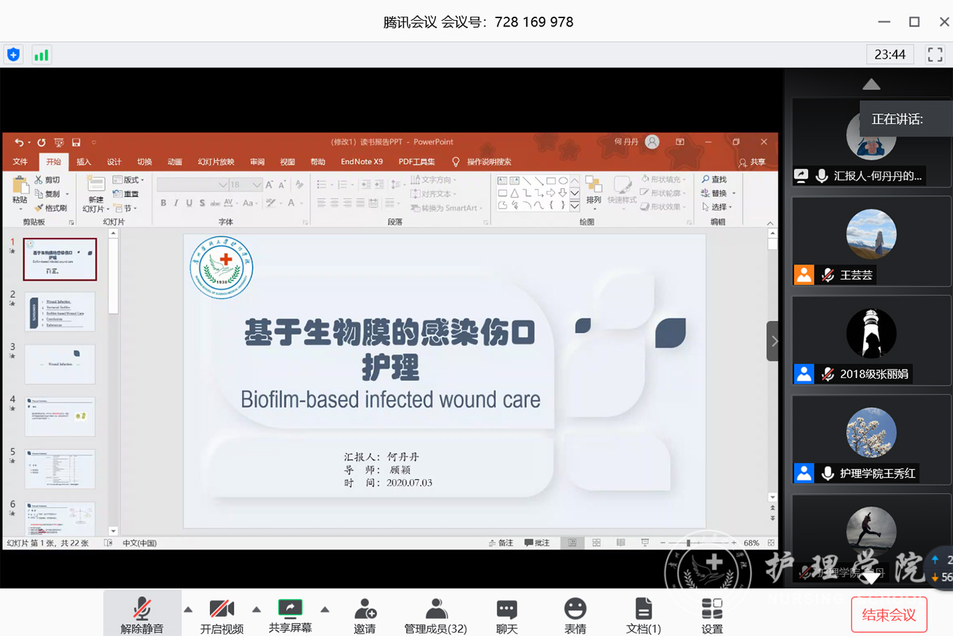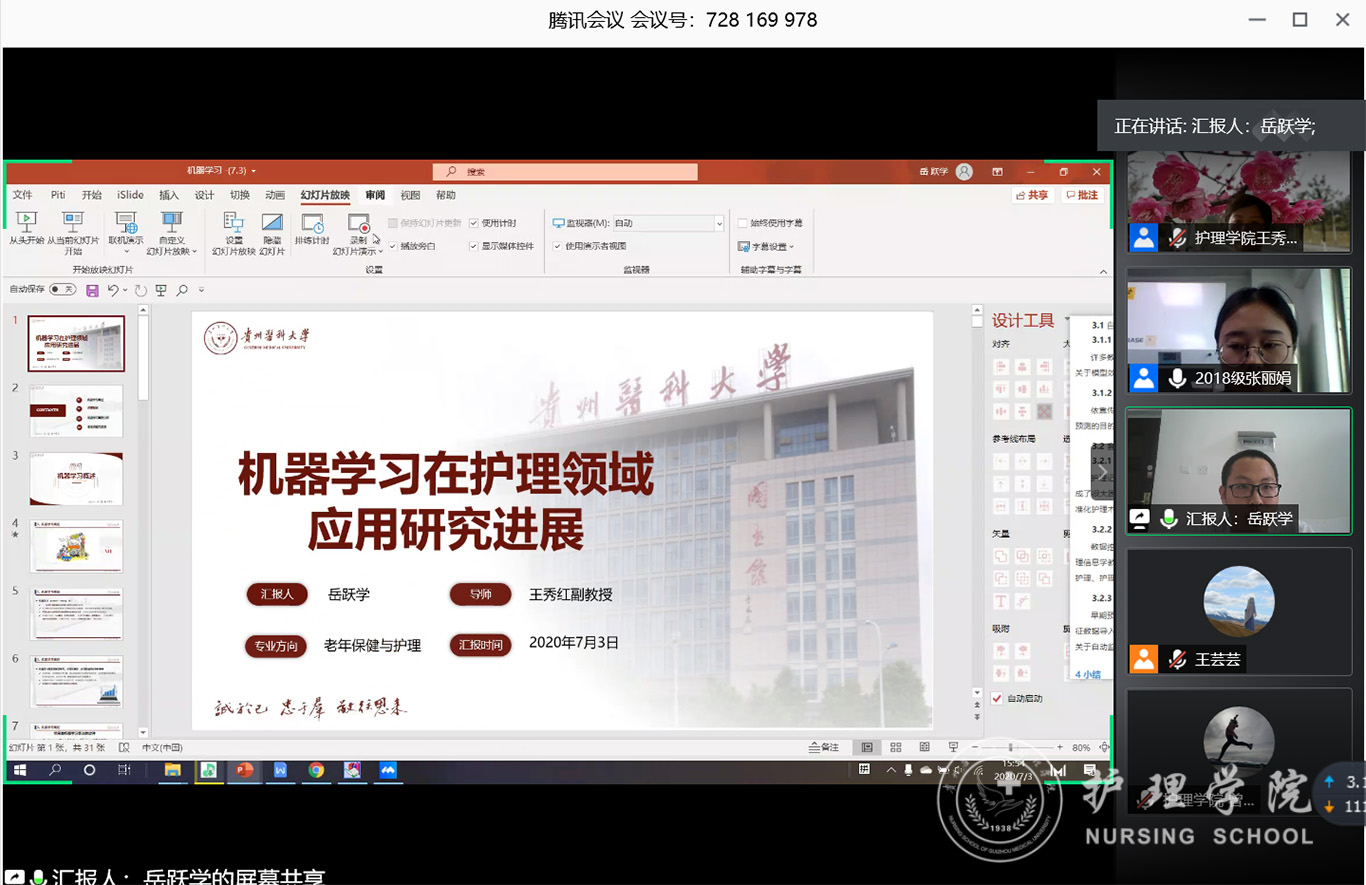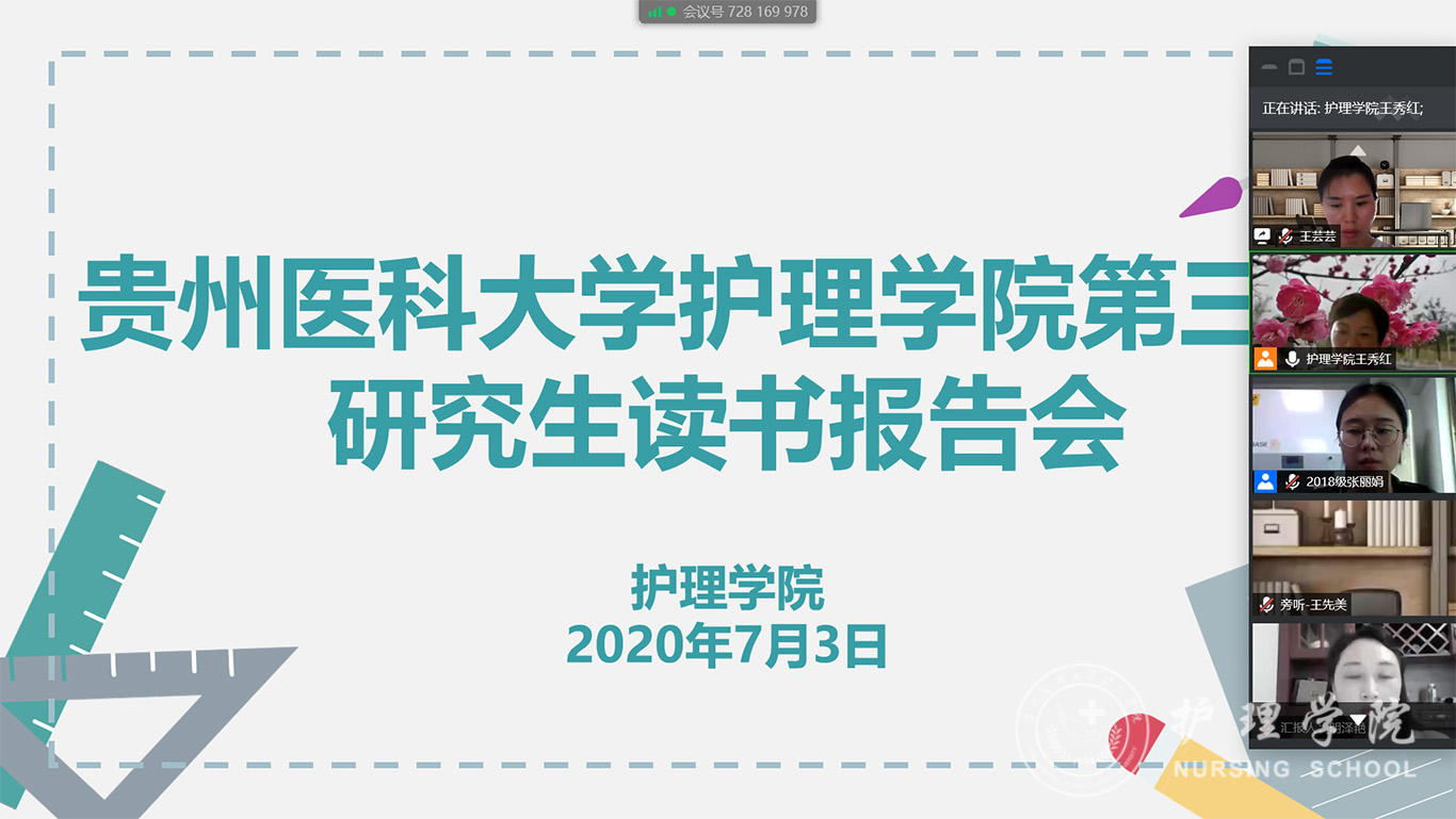 7月3日,allwincity万象城官方网站2020年第三期研究生读书报告会以“云会议”形式进行,allwincity万象城官方网站党委副书记王秀红、附属医院护理部副主任蔡鹏、allwincity万象城官方网站技能实验室主任周谊霞、附属医院分娩室护士长孙念梅、allwincity万象城官方网站各教研室主任、专业教师及研究生近40人参加会议。
