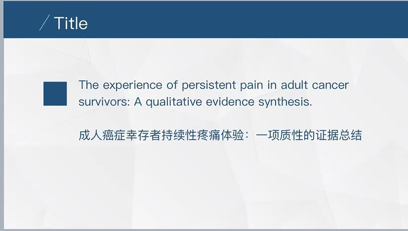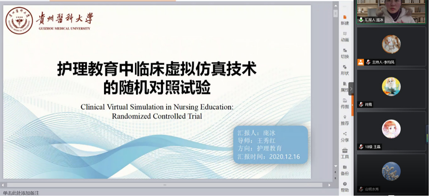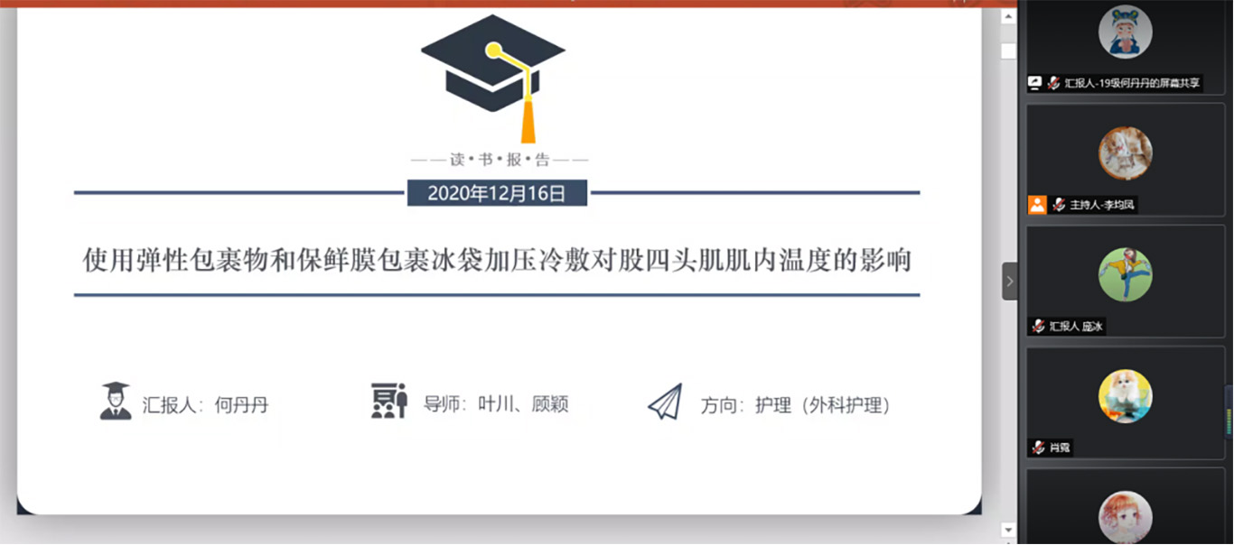读书报告会第一部分邓倩、何丹丹、庞冰分别进行汇报。邓倩以“成人癌症幸存者持续性疼痛体验”为主题,详细地介绍了质性研究的系统评价,从检索策略、文献筛选、质量评价、资料整合到提取主题等方面进行介绍。何丹丹以“使用弹性包裹物和保鲜膜包裹冰袋加压冷敷对股四头肌肌内温度的影响”为主题,从文献的研究背景、研究目的、实验方法等方面对文献进行分析。庞冰以“护理教育中临床虚拟仿真”为主题,从临床虚拟仿真技术的应用及优点,局限性及启示思考对虚拟仿真对护理教育的影响,并对未来的虚拟仿真在护理中的应用提出讨论。第二部分由参会老师、同学对汇报进行点评。