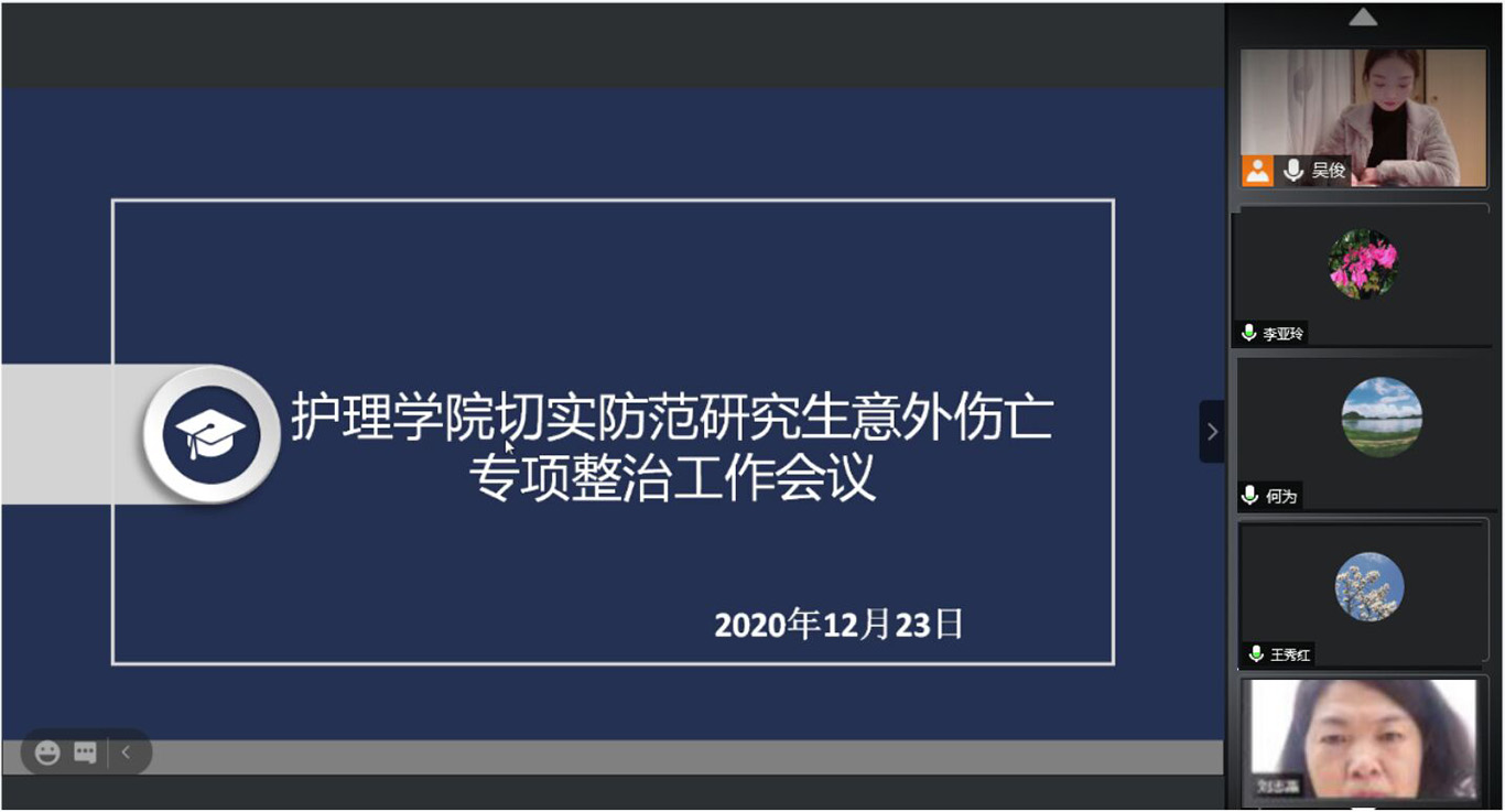 12月23日晚,为认真贯彻落实党中央和省委、省政府、省教育厅的重要批示精神,预防和减少研究生意外伤害事故的发生,按照allwincity万象城官方网站党委研究生工作部和学校下发文件。在腾讯会议上召开关于allwincity万象城官方网站防范研究生意外伤亡专项整治工作的会议。该会议由allwincity万象城官方网站2020级辅导员吴俊主持,党委委员、院长李亚玲,党委委员、副书记何为,党委委员、副院长王秀红以及全体研究生意外伤亡专项工作小组成员参加。