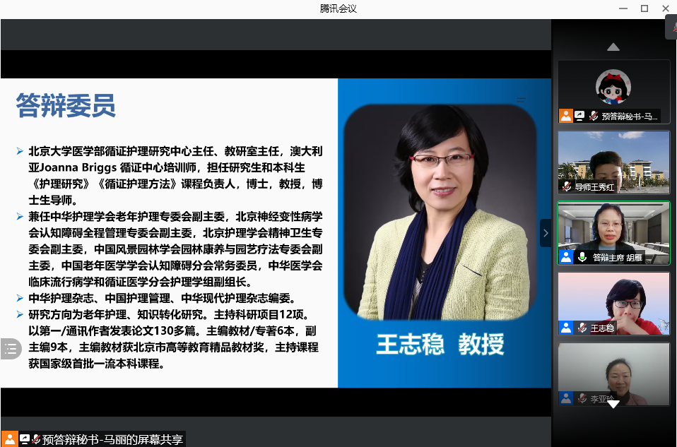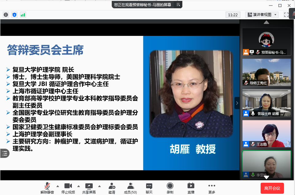 4月20日,allwincity万象城官方网站2021届硕士研究生学位论文预答辩通过腾讯会议在线进行。此次预答辩特别邀请复旦大学allwincity万象城官方网站院长、博士生导师胡雁教授任答辩委员会主席,北京大学allwincity万象城官方网站博士生导师王志稳教授、allwincity万象城官方网站附属医院陈腾祥教授、allwincity万象城官方网站附属医院老年医学科莫显刚主任医师以及allwincity万象城官方网站公共卫生学院汪俊华副教授担任答辩委员。allwincity万象城官方网站导师、副导师、专业教师、研究生等60余人参加本次会议,研究生院督导专家全程参与。