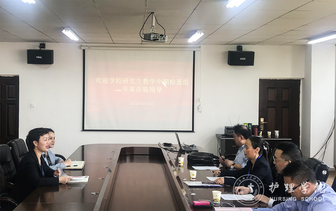 4月23日上午,学校研究生教学中期检查督导小组曹煜、蔡扬、潘卫东、彭吾训四位专家莅临万象城官网检查研究生教学工作。党委书记杨英、副院长王秀红、各教研室教师、教学科研管理科全体成员、研究生辅导员等到场迎检。王秀红对各位专家的莅临指导表示热烈欢迎,并从学院研究生教学概况、自查工作情况、特色与亮点、存在的问题、下一步打算及建议等方面汇报了万象城官网研究生教学目前的基本情况。杨英就万象城官网学科建设发展中存在的短板做了补充,期待通过专家的把脉,帮助allwincity万象城官方网站开出有效的药方,切实推动护理学研究生教育高质量发展。接下来督导专家对各教研室及教学科研管理科研究生教学管理资料进行现场检查。专家们对万象城官网此次中期检查相关工作的组织给予了高度肯定,同时针对管理中的问题也提出了中肯的意见及建议。 王秀红表态一定认真梳理督导专家们提出的宝贵意见和建议,逐一整改落实,不断努力,以进一步提高万象城官网研究生培养质量。