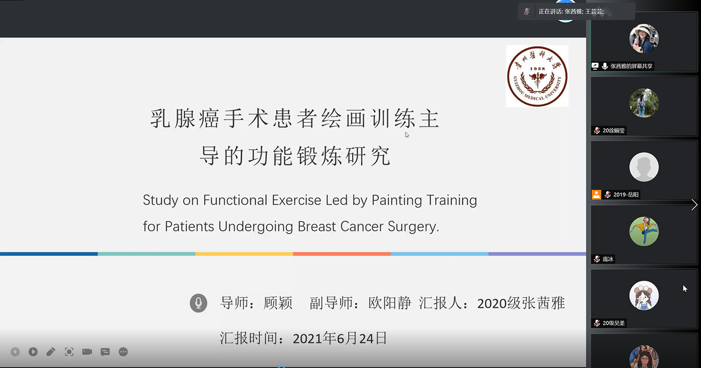 2020级研究生李雪、张茜雅、郭庆娇三位同学依次汇报。李雪汇报《社区老年人认知功能和抑郁情绪的纵向研究》,文章介绍了社区护理与实验心理学相结合对老年人抑郁情绪和认知功能的研究效果,汇报人从研究方法、统计学和模型构建三方面来充分阐述,并分享了学习心得。张茜雅分享了《乳腺癌手术患者绘画训练主导的功能锻炼研究》,介绍曼陀罗绘画和功能锻炼相结合的功能锻炼方法对乳腺癌患者的内心状况的影响。郭庆娇汇报《负压创面疗法辅助治疗儿童小面积烧伤的随机临床试验》,重点讲述了该研究通过融合负二项回归分析、亚组分析、泊松回归模型、混合效应模型、敏感性分析及风险预测模型等多种统计分析方法,探讨标准ActicoatTM、MepitelTM敷料联合NPWT治疗儿童小面积烧伤的疗效。参会老师及同学分别对三位同学的汇报进行了点评,并给出意见和建议。