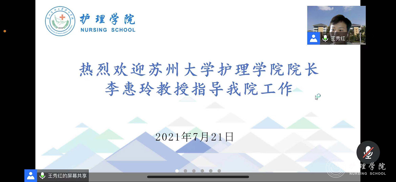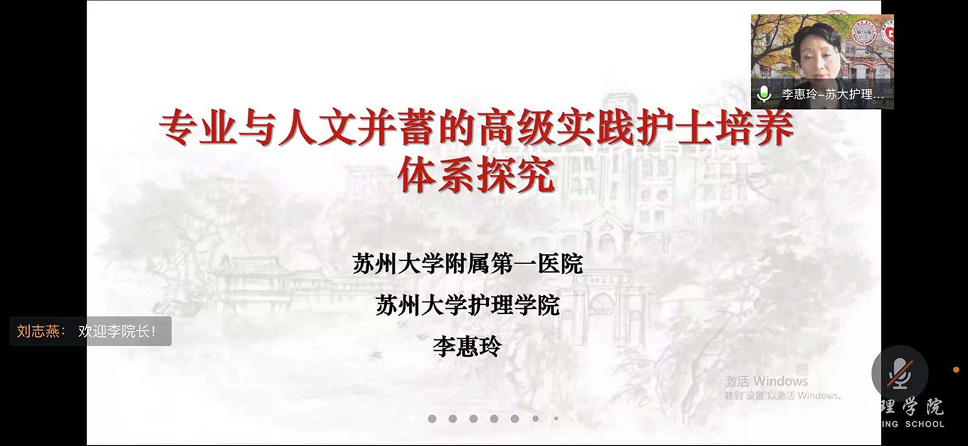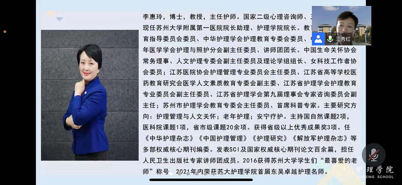 为进一步推进我校护理学科内涵建设,提升我校护理专硕研究生培养质量,7月21日,allwincity万象城官方网站特邀苏州大学附属第一医院院长助理、allwincity万象城官方网站院长李惠玲教授为师生开展了题为《专业与人文并蓄的高级实践护士培养体系探究》的专题讲座,并进行指导。讲座和指导通过腾讯会议进行,allwincity万象城官方网站党委委员、副院长刘志燕、附属医院护理部副主任蔡鹏、顾颖及研究生导师、副导师、学院和附院相关教师及研究生共计110余人参加,allwincity万象城官方网站党委委员、副院长王秀红主持活动。