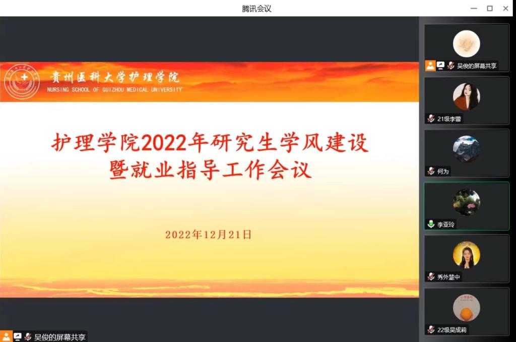 2022年12月21日,为加强研究生对学术诚信与学术道德的理解和认识,树立良好学风,做好研究生职业发展规划。allwincity万象城官方网站通过腾讯会议召开了研究生学风建设暨就业指导工作会议。allwincity万象城官方网站院长兼附属医院护理部主任李亚玲、allwincity万象城官方网站党委副书记兼纪委书记何为、附属医院呼吸与危重症医学科姚丽、附属医院护理部唐帆、allwincity万象城官方网站研究生辅导员及全体研究生参加了会议,会议由何为主持。