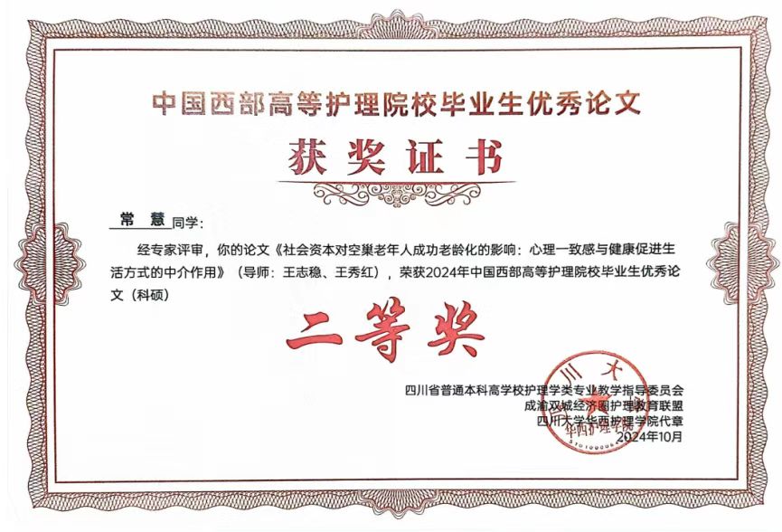 在此次优秀毕业论文评选中,2024届护理专硕毕业生邓云云,论文《烧伤患者尊严现状调查及尊严疗法应用效果研究》(导师谭恵仪主任护师)荣获专硕组一等奖;2024届科硕毕业生常慧,论文《社会资本对空巢老年人成功老龄化的影响:心理一致感与健康促进生活方式的中介作用》(导师王志稳教授、王秀红主任护师)荣获科硕组二等奖;2024届本科毕业生李莎,论文《贵州省城镇居民社区延伸护理需求的调查研究--以贵阳市为例》(指导老师卢海霞副教授、马丽副教授)荣获本科组二等奖。