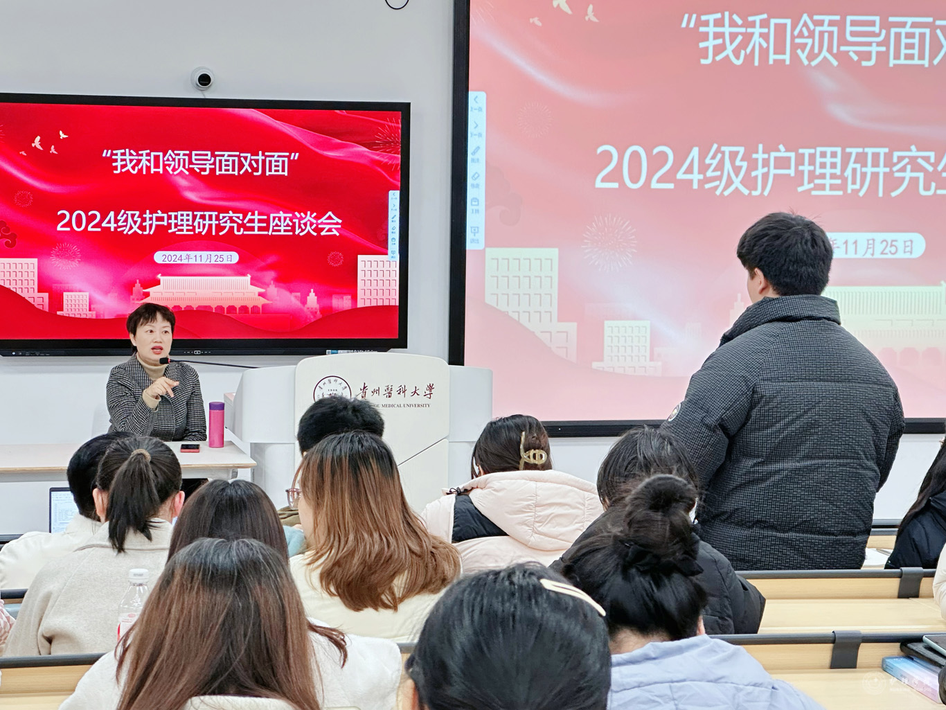 11月25日,allwincity万象城官方网站在云漫湖校区临床组团酬勤楼M204教室召开了“我和领导面对面”研究生师生交流会。allwincity万象城官方网站副院长王秀红、辅导员殷艳及全体2024级护理研究生参会。