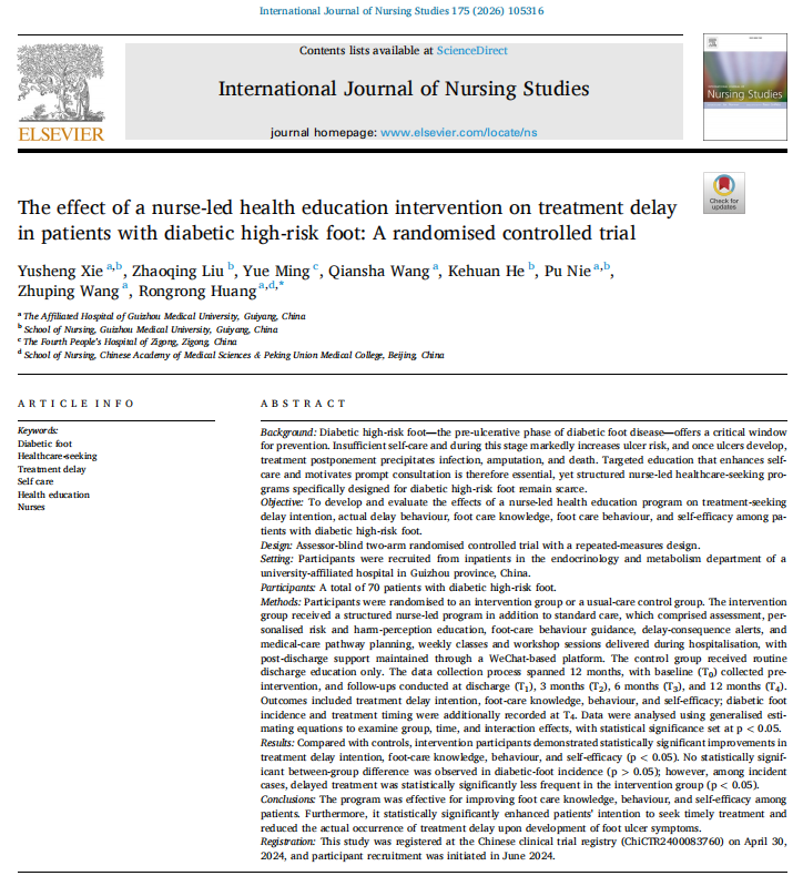 在护理学科创新探索的前沿,万象城官网学子再度彰显卓越学术风采。近日,万象城官网2022级硕士毕业生谢玉生以第一作者身份,在国际护理顶级期刊《International Journal of Nursing Studies》发表题为“The effect of a nurse-led health education intervention on treatment delay in patients with diabetic high-risk foot: A randomised controlled trial”的研究论文,通讯作者为黄蓉蓉老师。该研究验证了由护士主导的健康教育项目能有效改善糖尿病高危足患者的就诊延迟意向,减少其发生足部病变后的就诊延迟现象,为临床糖尿病足的早期护理与管理提供了重要实证依据。