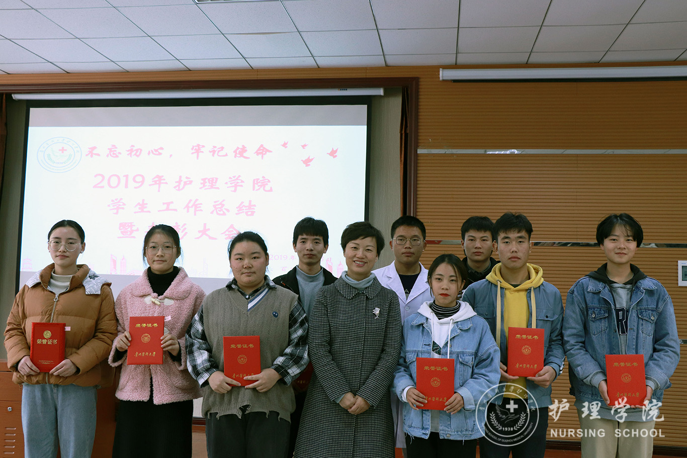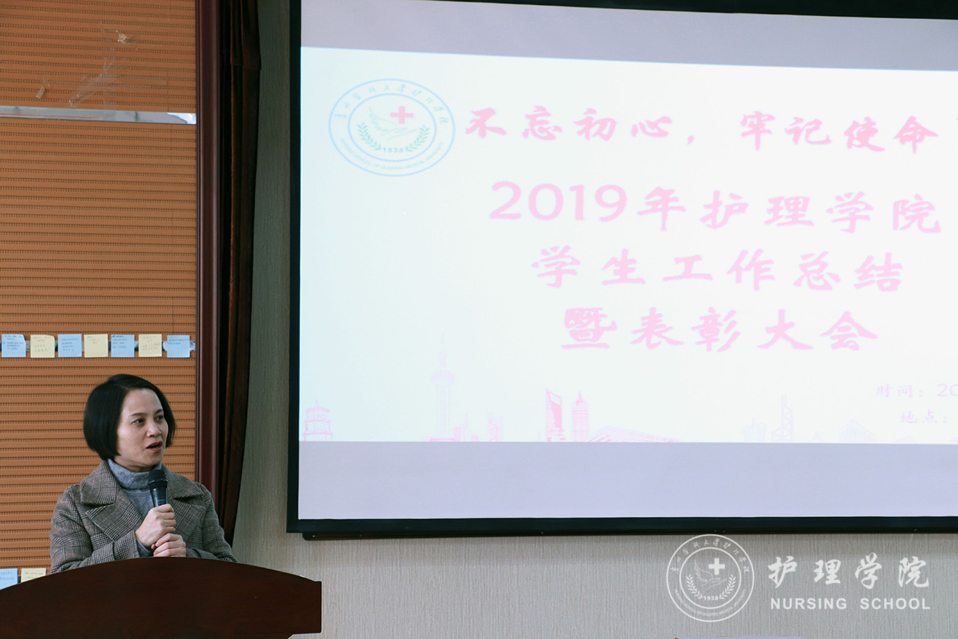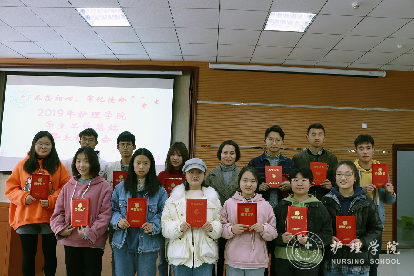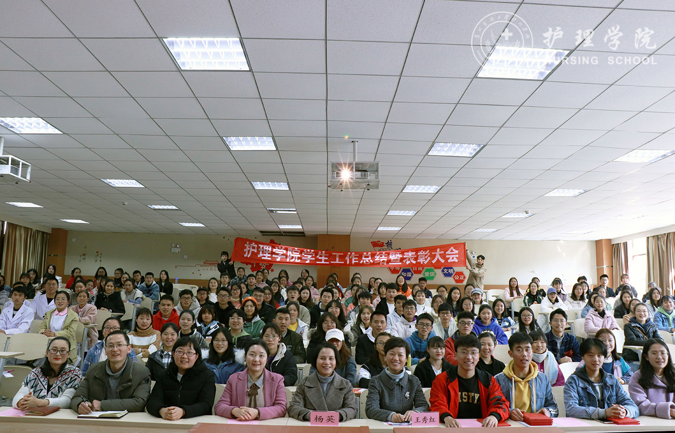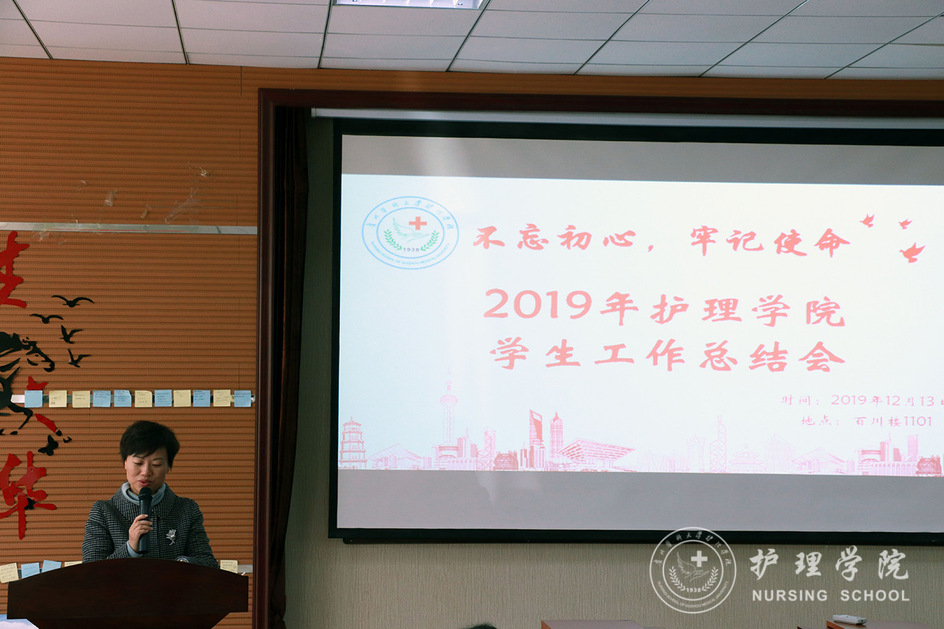 为贯彻落实习近平总书记系列重要讲话精神和党的“不忘初心、牢记使命”主题教育精神要求,全面总结学院2019年度学生工作内容、表彰先进,12月13日中午,allwincity万象城官方网站在南校区百川楼1101教室隆重召开2019年学生工作总结暨表彰大会。allwincity万象城官方网站党委书记杨英、党委副书记王秀红、正科级组织员曾敏、辅导员及学生会、团学工作办公室、护理技能协会、男护生协会和各班级学生干部代表100余人参加大会。会议由学院团委副书记王晓玲主持。