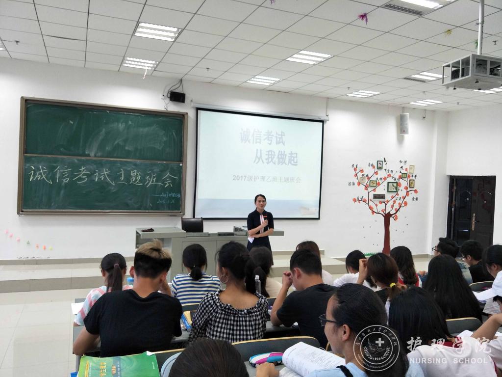 为了提高教学管理质量,帮助学生养成良好的学习习惯,培养健康的心理状态及人文素养,allwincity万象城官方网站于6月26日晚6:00在南校区7404、7406教室开展诚信考试暨大学生心理健康教育主题班会。班会由各班班长主持,班主任吴俊、王丽主讲,2017级护理甲班、乙班全体同学参加。