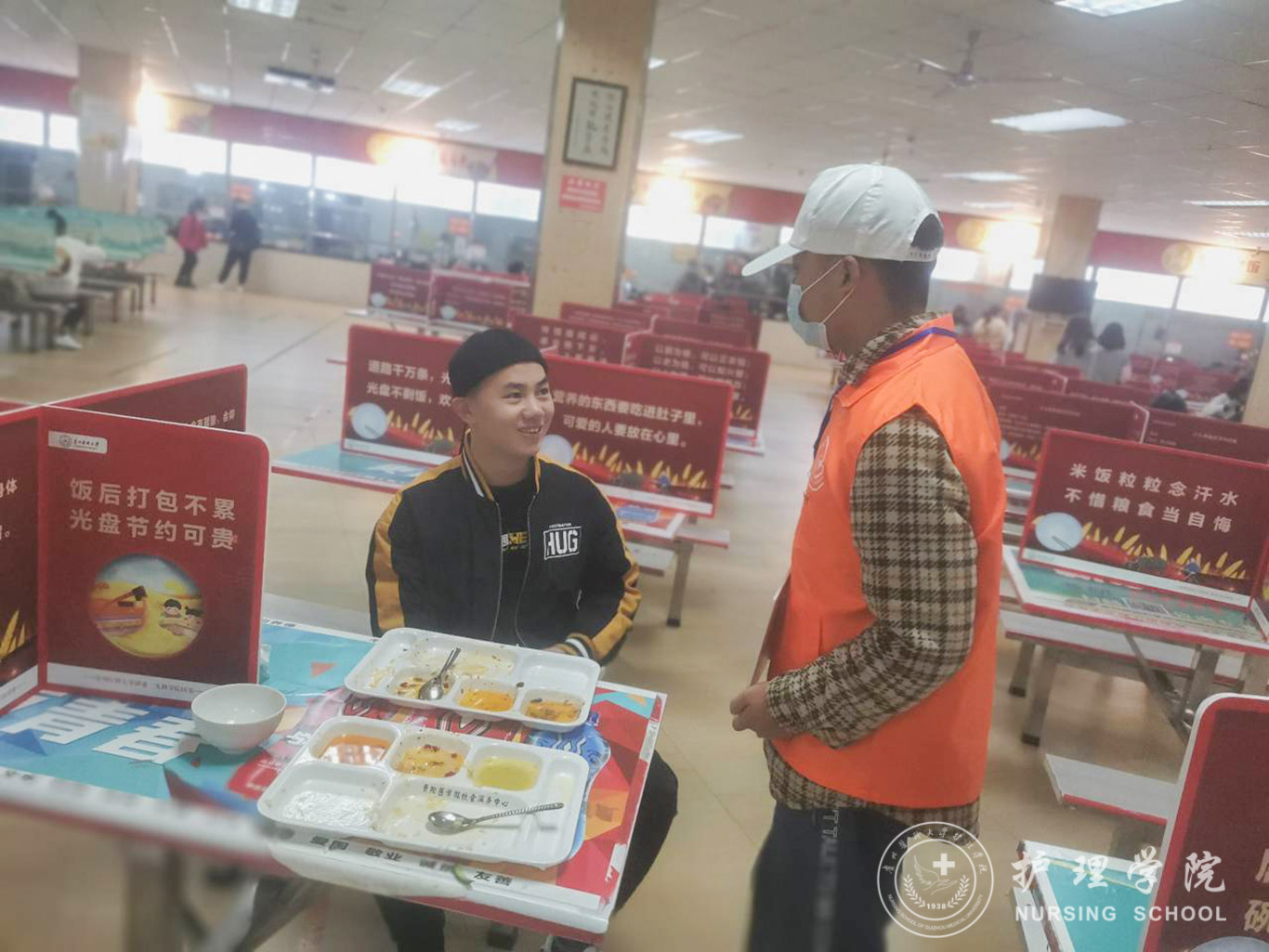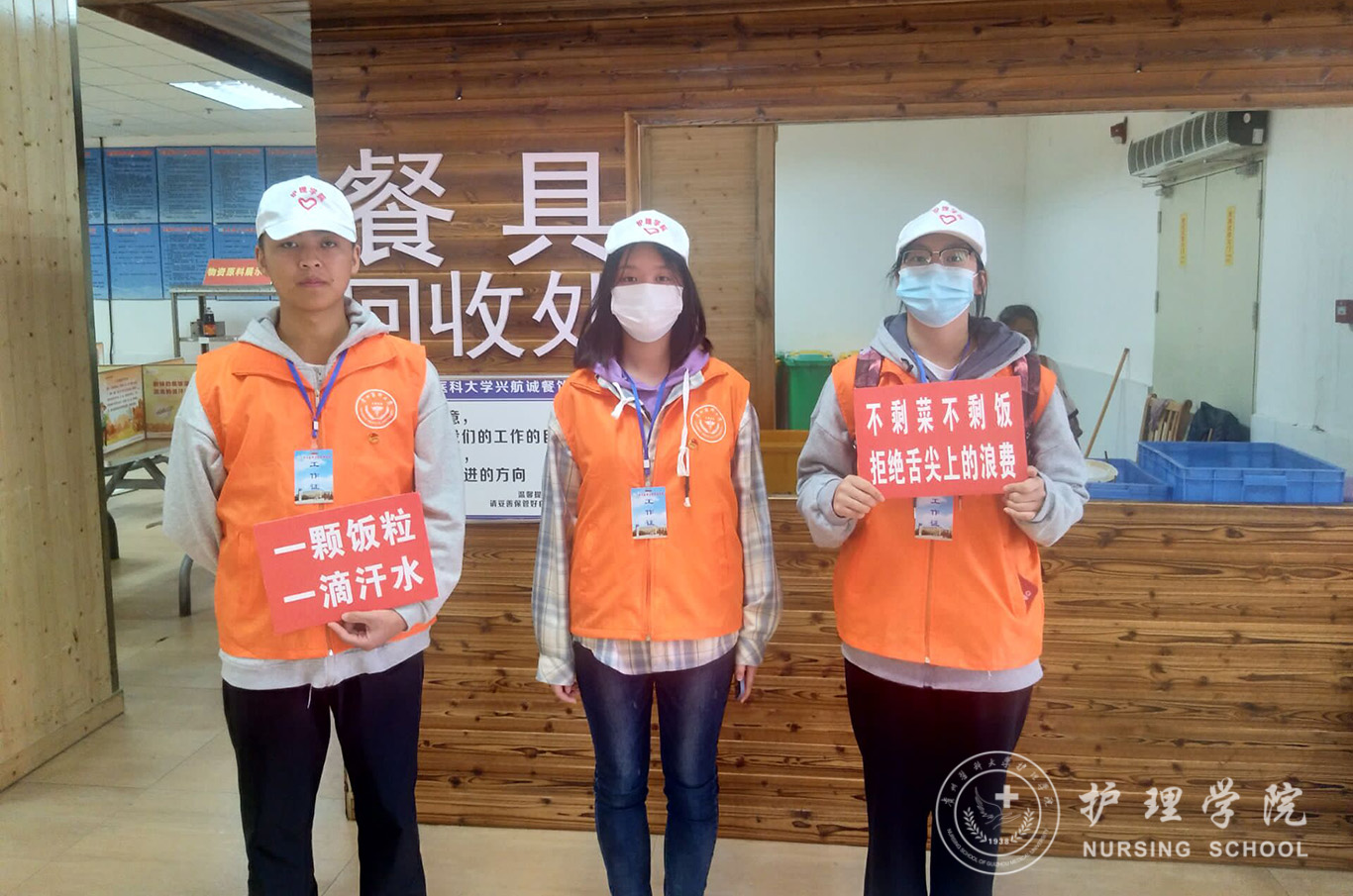 志愿者们身穿鲜明的服装,手持印有“厉行节约、反对浪费”的宣传标语,站在食堂门口仔细观察已用完餐的老师、同学们的餐盘,观察浪费情况的严重与否,对手持空盘的同学表示赞许,通过随机的方式,任意选取正在就餐的同学询问一些问题,了解同学们的饮食习惯及对节约粮食的看法或做法,帮助同学们在生活中树立节约的良好习惯。
