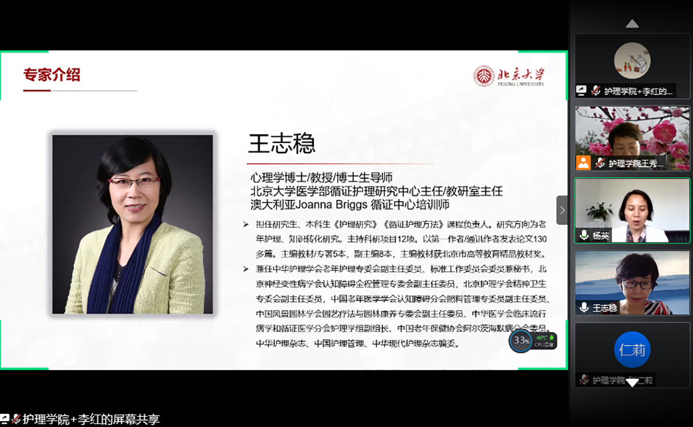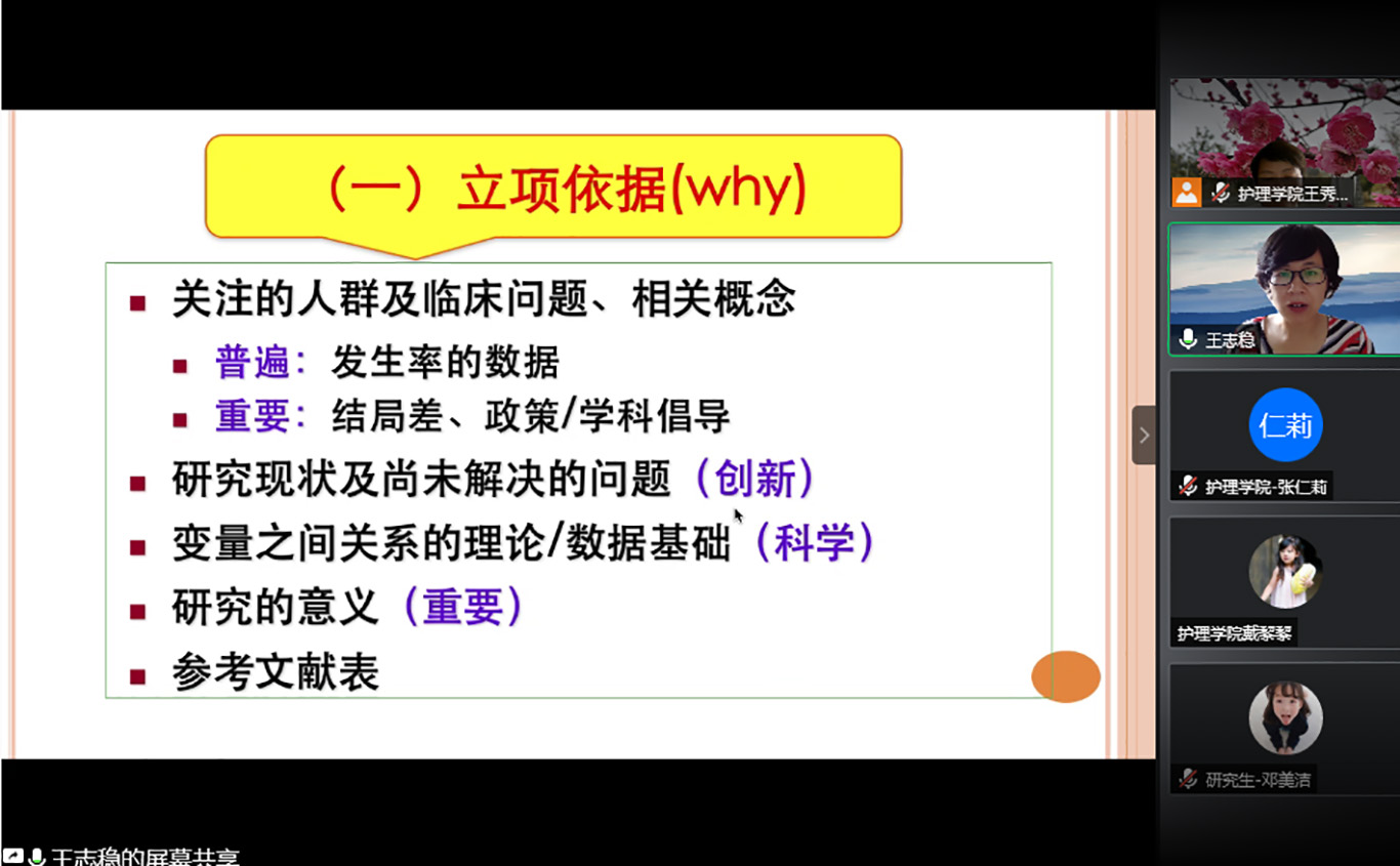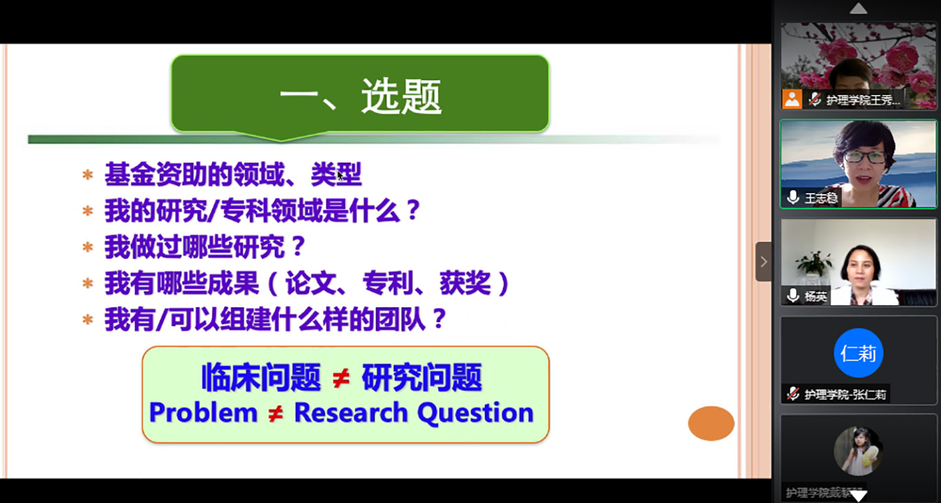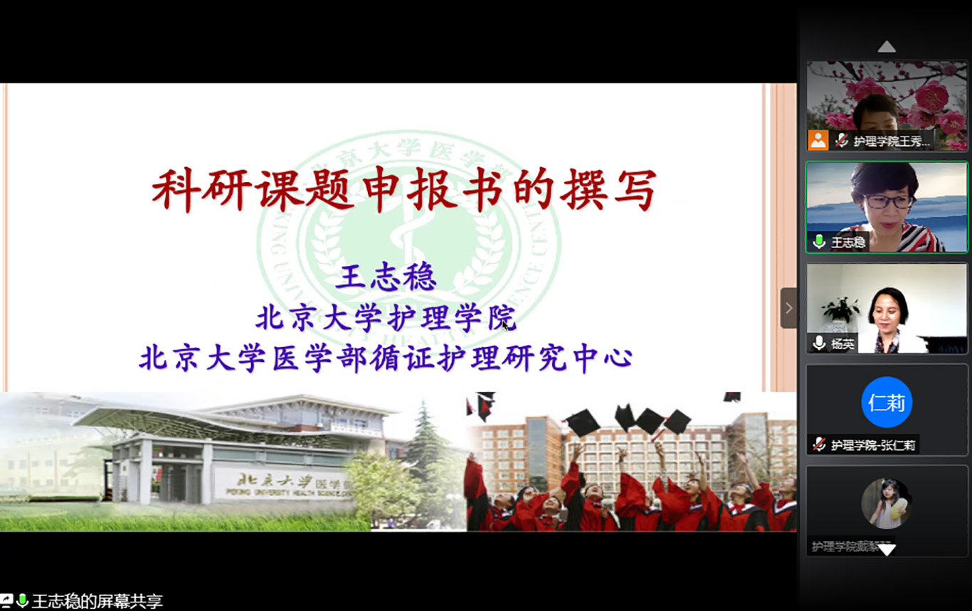 为进一步提升我校护理学科科学(教学)研究水平,加强护理学科内涵建设,促进护理学科科研(教学)团队的建设,培育新型护理学术(专业)人才,推动我校护理学科及各附属医院护理科研(教研)的总体发展。6月24日下午,北京大学allwincity万象城官方网站博士生导师、循证护理研究中心主任王志稳教授受邀为我校护理教师及研究生开展了题为“护理科(教)研申报书撰写”的专题讲座。会议通过腾讯会议平台进行,allwincity万象城官方网站及附属医院、第二附属医院、第三附属医院、附属白云医院等直属附属医院部分教师和研究生近100人参加了讲座,allwincity万象城官方网站党委书记杨英主持会议。
