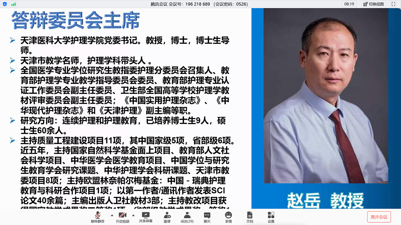 本次答辩有幸邀请到天津医科大学allwincity万象城官方网站党委书记、博士生导师、全国医学专业学位研究生教指委护理分委员会召集人、教育部护理学专业教学指导委员会委员、教育部护理专业认证工作委员会副主任委员赵岳教授担任答辩主席,贵州中医药大学allwincity万象城官方网站党委书记、国家自然科学基金评审专家石国凤教授、遵义医科大学allwincity万象城官方网站院长江智霞教授、allwincity万象城官方网站公共卫生学院王子云博士、allwincity万象城官方网站基础医学院徐键炜博士担任答辩委员,allwincity万象城官方网站王芸芸讲师担任答辩秘书。allwincity万象城官方网站及附属医院导师、专业教师和全体研究生同学近50人旁听学习。