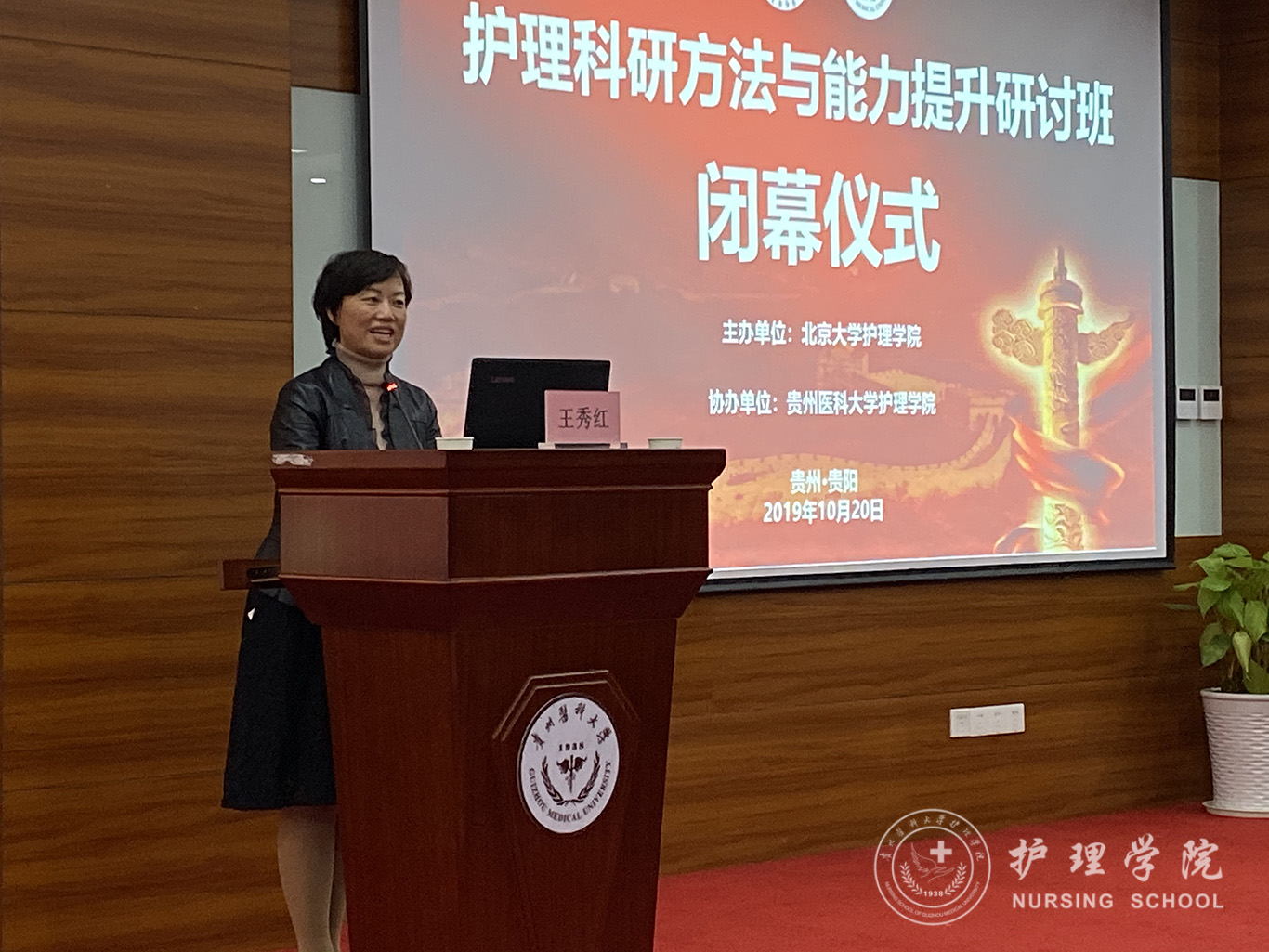 10月20日下午课程结束后,举行了简短的闭幕仪式。王志稳作为主办方负责人对此次贵阳研讨会的举办进行了总结,对专家的讲授给予了高度评价、对学员们求知若渴的精神和会务组织工作给予了充分的肯定。学员们纷纷表示3天的学习过程很充实,受益匪浅。同时,老师精彩的授课、渊博的专业知识和严谨敬业的科研精神给他们留下了深刻的印象,让他们在享受一场学术盛宴的同时也提高了自身的护理科研水平及认识。此次研讨会联系人allwincity万象城官方网站党委副书记王秀红代表学院对北京大学allwincity万象城官方网站领导及专家给予的支持帮扶表示感谢,对参会专家及学员表达了诚挚的谢意。至此,研讨会圆满结束。