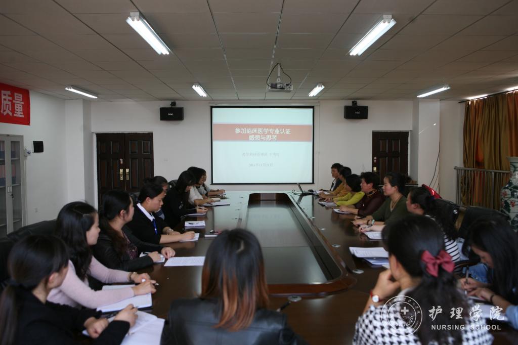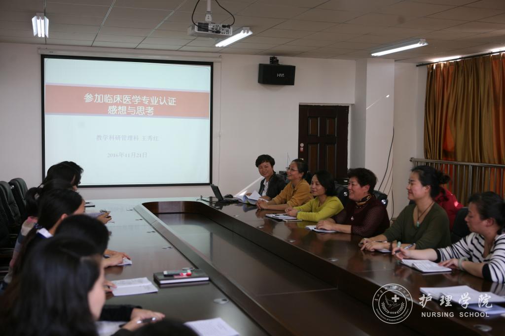 紧接着王秀红科长分享了她参加11月14日-17日我校临床医学专业认证工作的感想和思考。通过多天的跟随走访,了解到认证工作中专家的实地考察的内容和重点。观摩了校本部理论和实验教学课、附属医院的指导操作教学查房、病例讨论等教学活动。结合临床和护理专业认证标准,王秀红科长从宗旨与目标、教育计划、学生成绩评定等十个方面对跟随走访过程中的要素进行了全面分析,并结合即将进行的本科教学审核评估工作、护理专业认证工作提出allwincity万象城官方网站的整改建议和努力方向,进一步明确和强化了教学实施过程及相关管理要求,为真正落实“以评促建、以评促改、以评促管、评建结合、重在建设”核心方针,突出内涵建设、强化内部质量保障体系建设树立牢固基础。