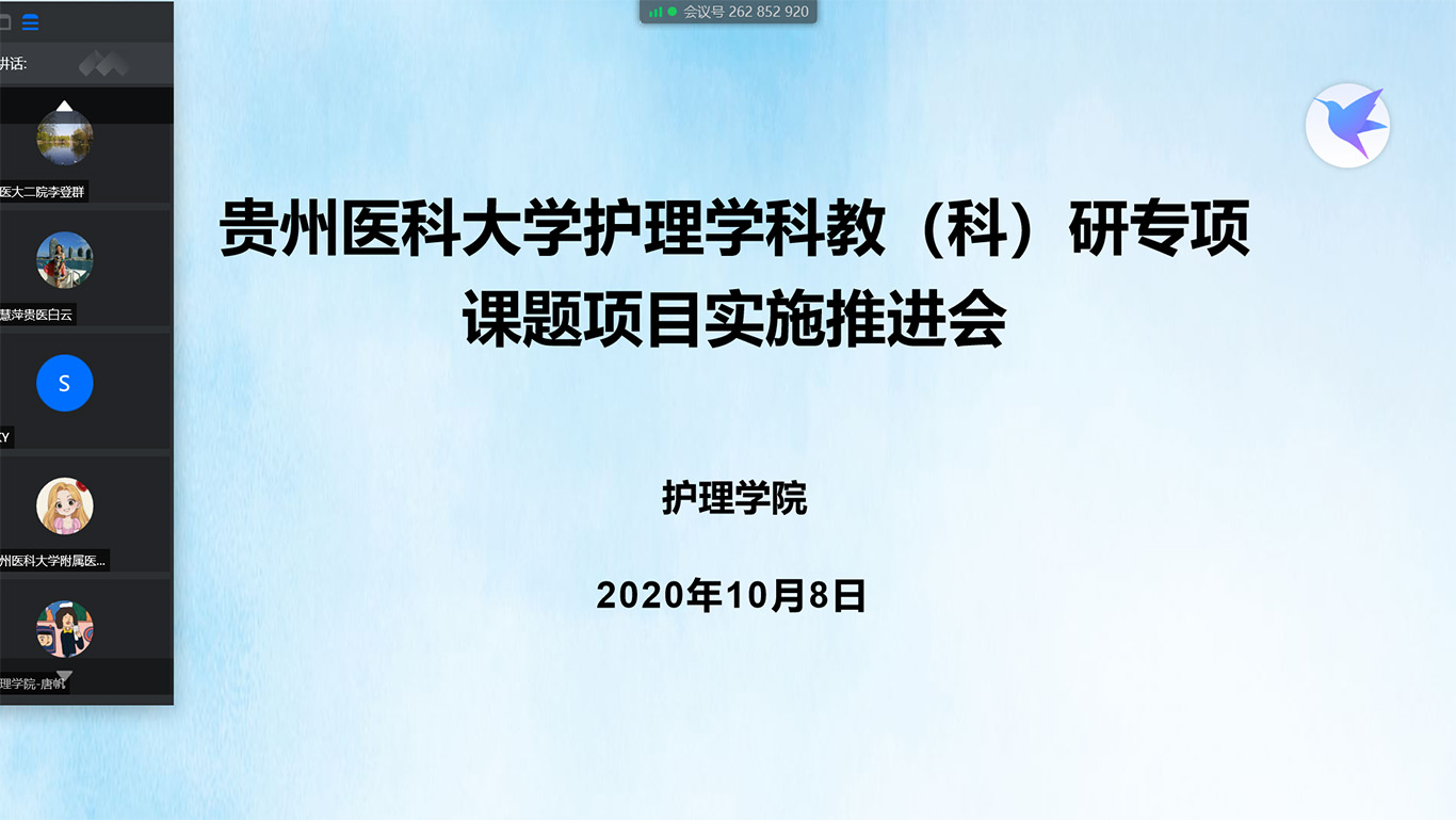 10月8日晚,由allwincity万象城官方网站组织召开的2020年allwincity万象城官方网站护理学科教(科)研专项课题项目实施推进会通过腾讯会议形式举行,allwincity万象城官方网站、附属医院、第二附属医院、第三附属医院、附属肿瘤医院、附属白云医院、附属乌当医院等7家直属附院的课题负责人近50人参会,会议由allwincity万象城官方网站院长李亚玲主持。