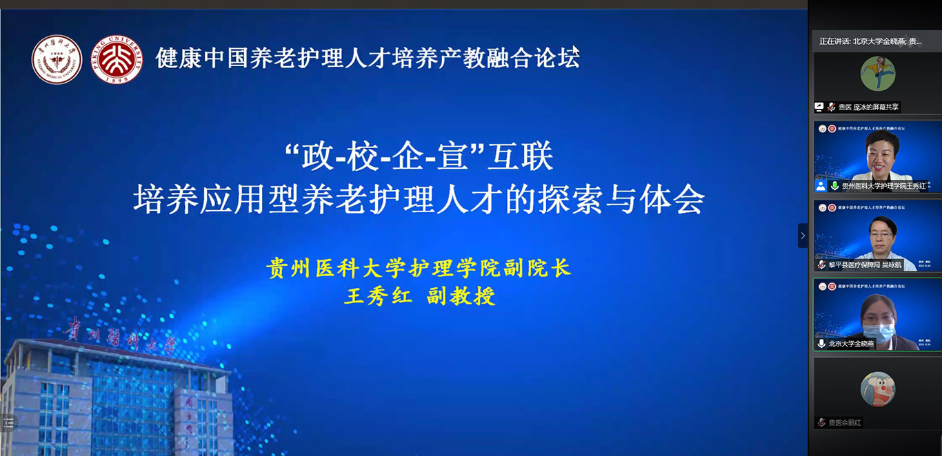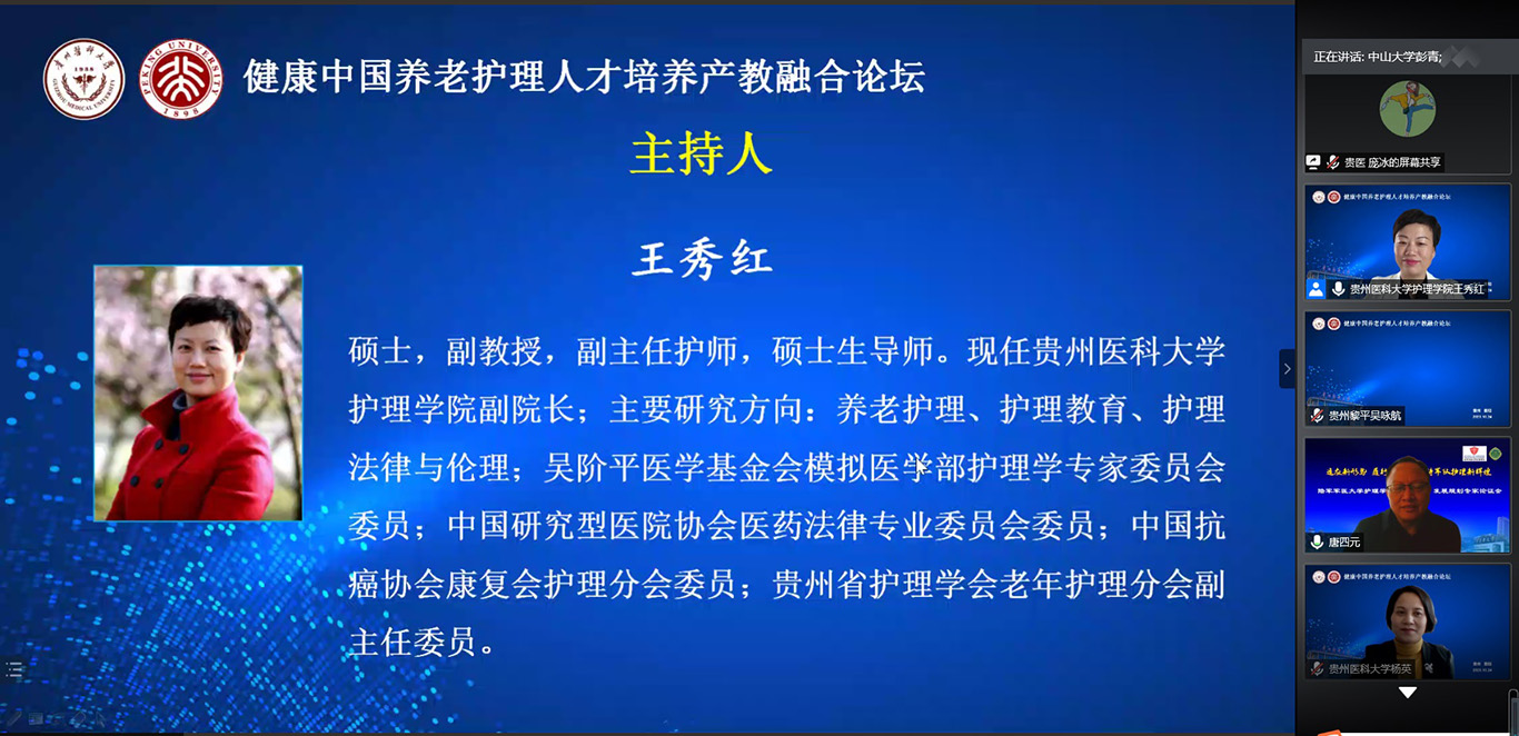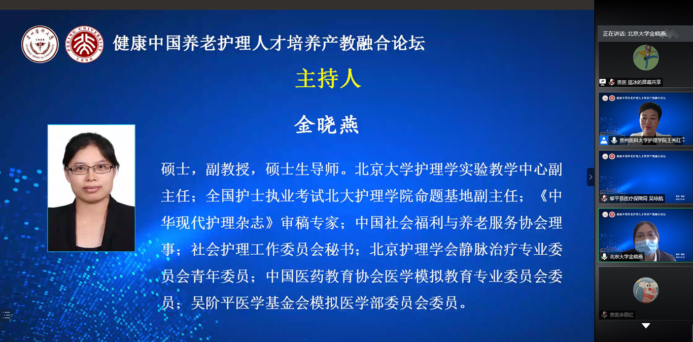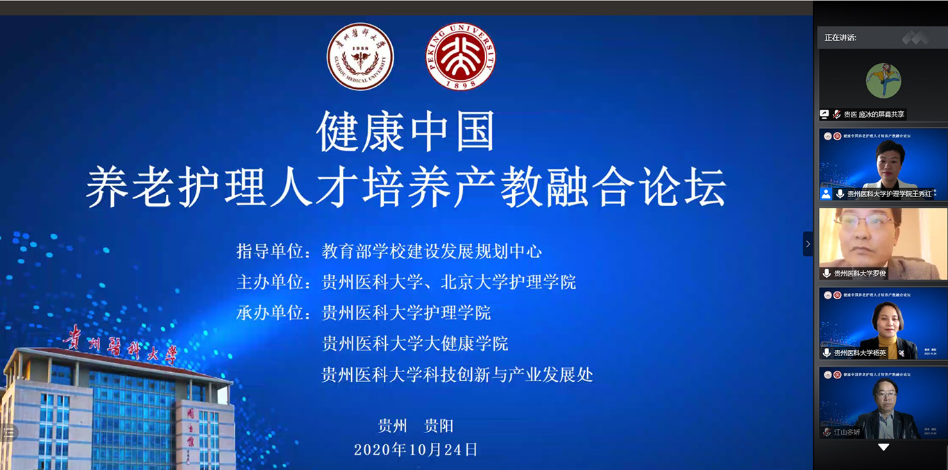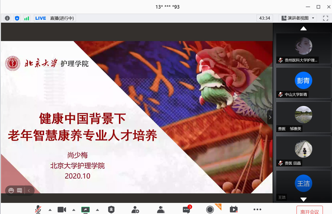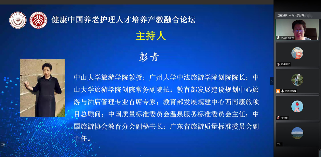 中国已经进入人口老龄化快速发展阶段,老年护理需求与老年护理人才供给严重失衡,如何才能更好培养符合社会需求的老年护理人才,满足养老市场需要?10月24日,2020年老年节前一天,allwincity万象城官方网站联合北京大学allwincity万象城官方网站在线举办了《健康中国养老护理人才培养产教融合论坛》,全国各地近400名护理、养老、康旅等方面从业者通过会议及同步直播参会。论坛由allwincity万象城官方网站党委书记杨英、中山大学旅游学院教授彭青、北京大学allwincity万象城官方网站副教授金晓燕、allwincity万象城官方网站副院长王秀红分别主持。