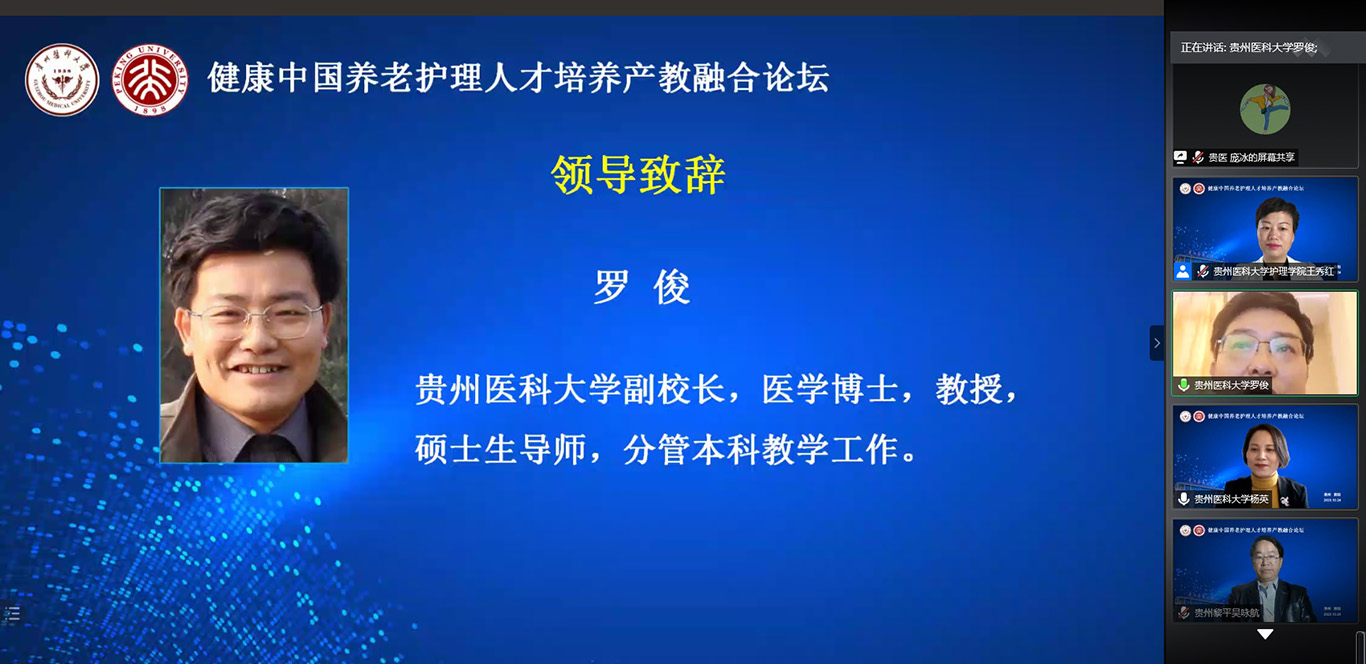 论坛开幕式上allwincity万象城官方网站副校长罗俊教授代表学校对此次论坛的召开表示热烈的祝贺,对参会专家表示热烈欢迎和感谢,并对allwincity万象城官方网站历史沿革和发展现况做了简要的介绍,同时对贵医人在抗击新冠肺炎疫情中救死扶伤、大爱无疆的精神和多年来服务地方、博济四方,致力于医疗卫生人才培养和助力基层卫生服务和养老护理服务等工作做了概况性介绍。