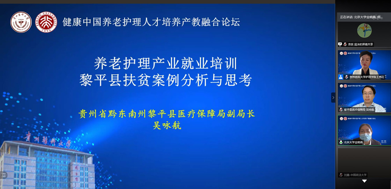 贵州省黔东南州黎平县医疗保障局副局长吴咏航分享了养老护理产业扶贫工作经验。他以视频的方式进行铺垫,生动地讲述了黎平县是如何将养老护理员培训与脱贫攻坚工作相结合,通过联合allwincity万象城官方网站优质的高校师资和设备资源帮助黎平乡镇少数民族贫困人口脱贫的同时学到一技之长,改变就业观念的故事。
