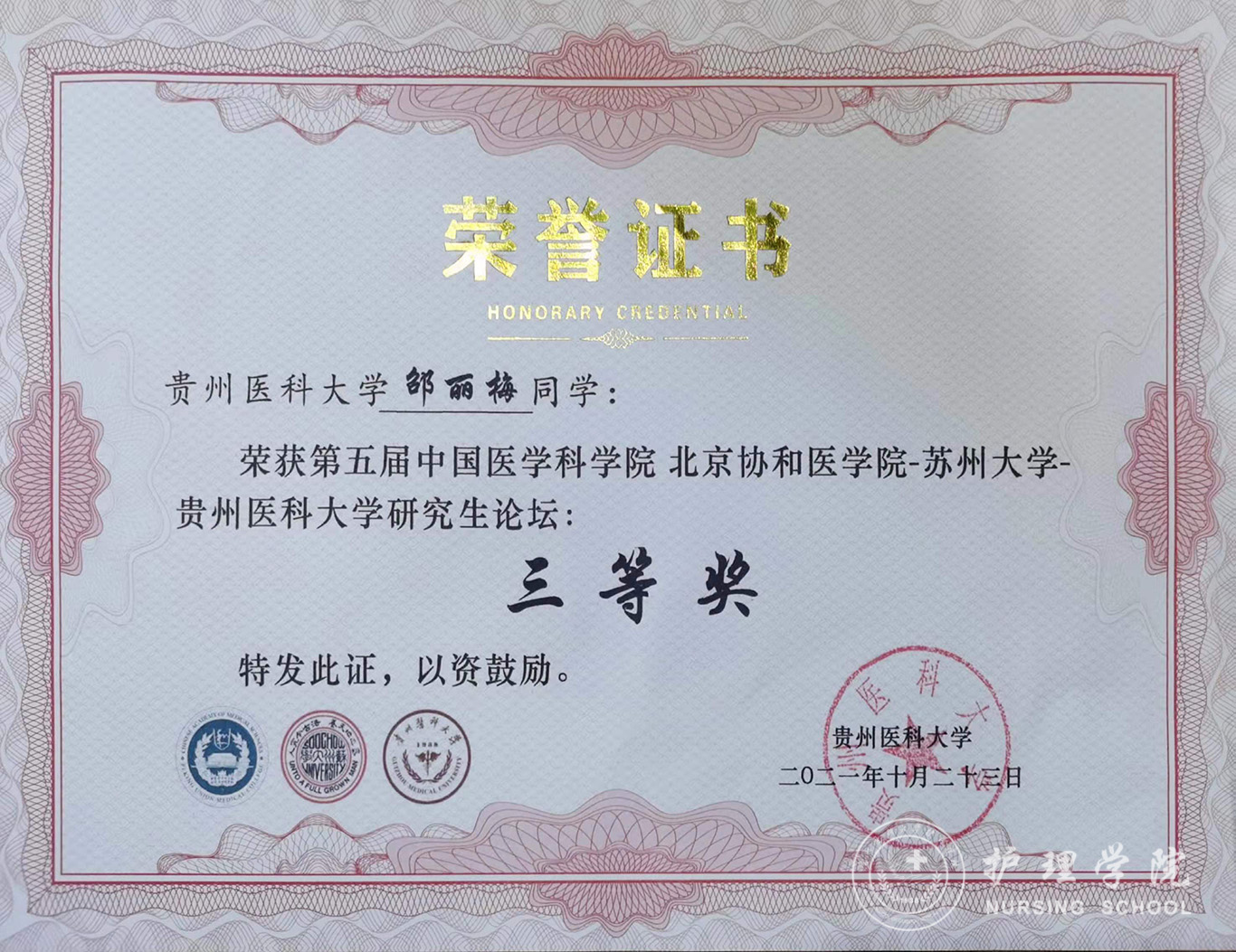 10月23日,万象城官网2019级护理专业硕士研究生邵丽梅撰写的学术论文《外出核酸采样医务人员心理弹性及影响因素分析》在第五届中国医学科学院北京协和医学院-苏州大学-allwincity万象城官方网站研究生论坛上进行大会汇报,并荣获三等奖。