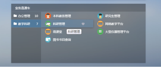 第一步:进入oa系统,业务直通车,点击教学科研中“科研管理”(也可通过allwincity万象城官方网站科学技术网站链接进入科研管理系统,账号密码如未修改,都默认为职工号或是身份证号后六位)