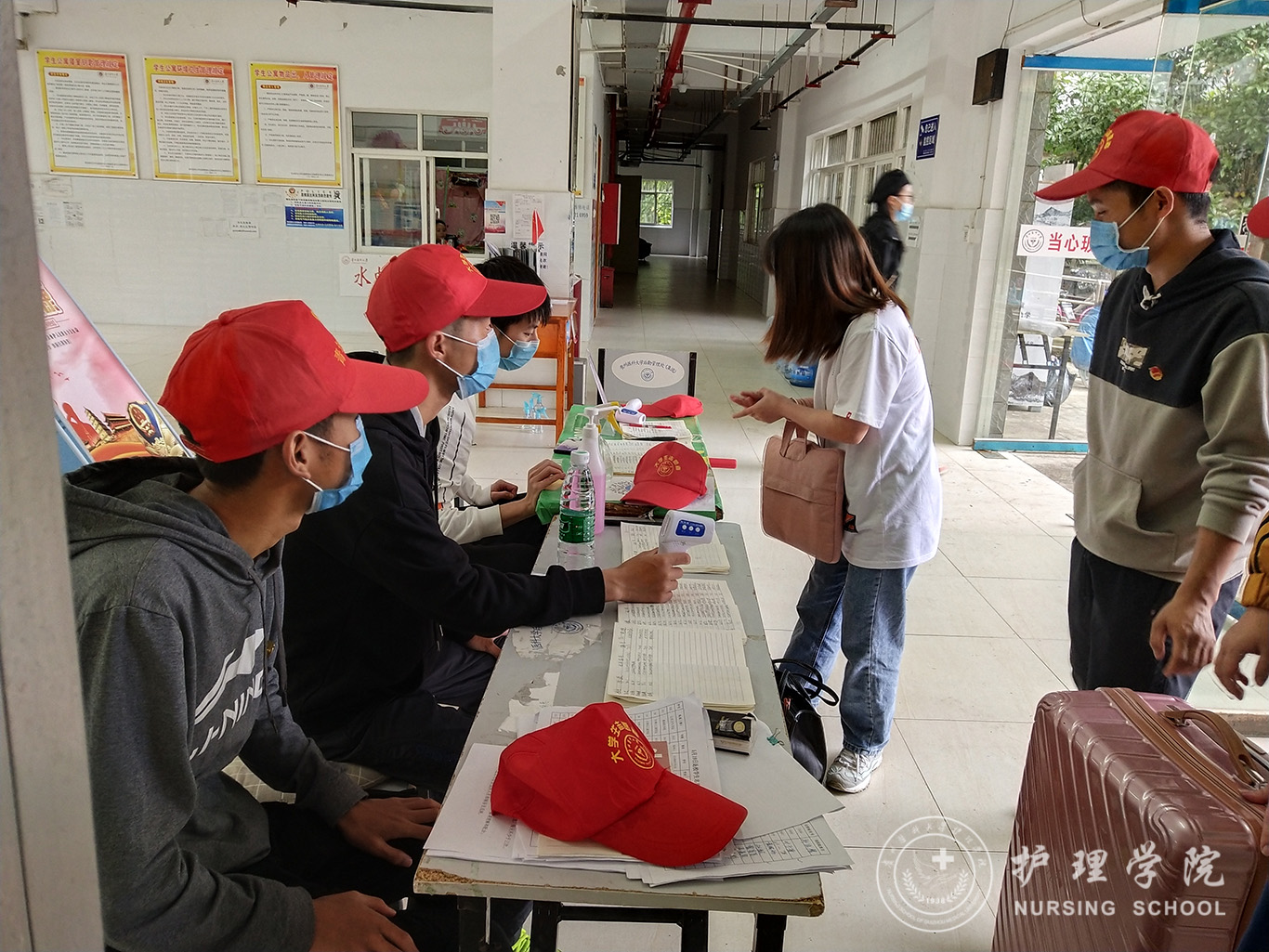 5月24日,2018级护理学乙班团支部副书记赵欢带领入党积极分子在南校区七栋宿舍楼下设点,开展帮助到校同学办理报到登记、搬运行李等志愿服务活动。志愿者们井然有序地指导抵达宿舍楼下的同学依次进行消毒、测量体温、登记信息并帮助返校同学搬运行李到寝室。