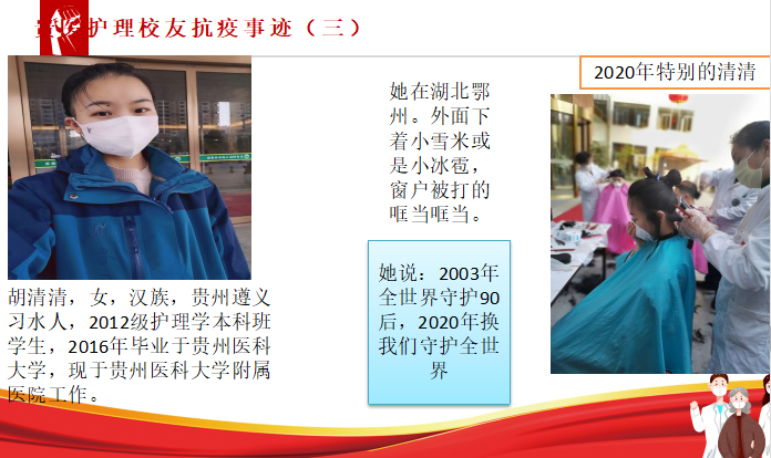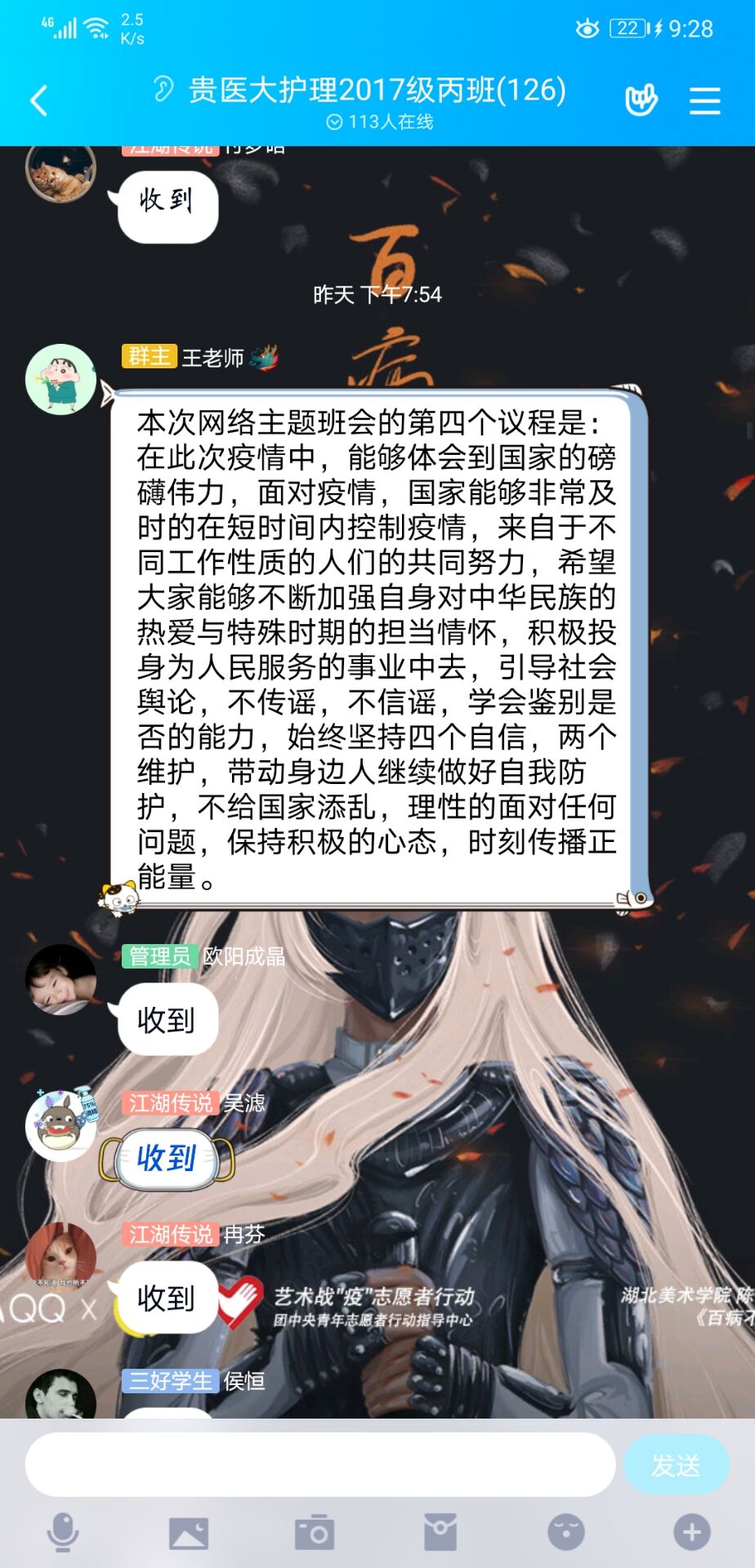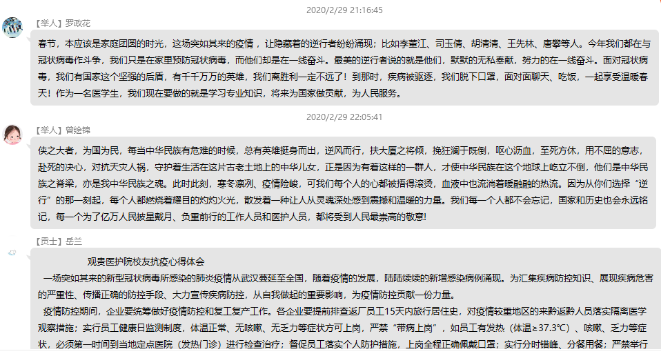 各班辅导员老师结合当前新冠肺炎疫情防控工作和学生们面临的主要问题,有针对性地开展网络思想政治教育。例如,17级、18级辅导员通过宣讲贵医护理校友的抗疫事迹和贵医护理学子做疫情防控志愿者的事迹来开展思想政治教育和专业教育,引导学生结合自身实际开展讨论,分享感悟,使广大学生对护理专业有了更大的认同,对生命健康有了更大的热爱,对志愿服务有了更大的热情。