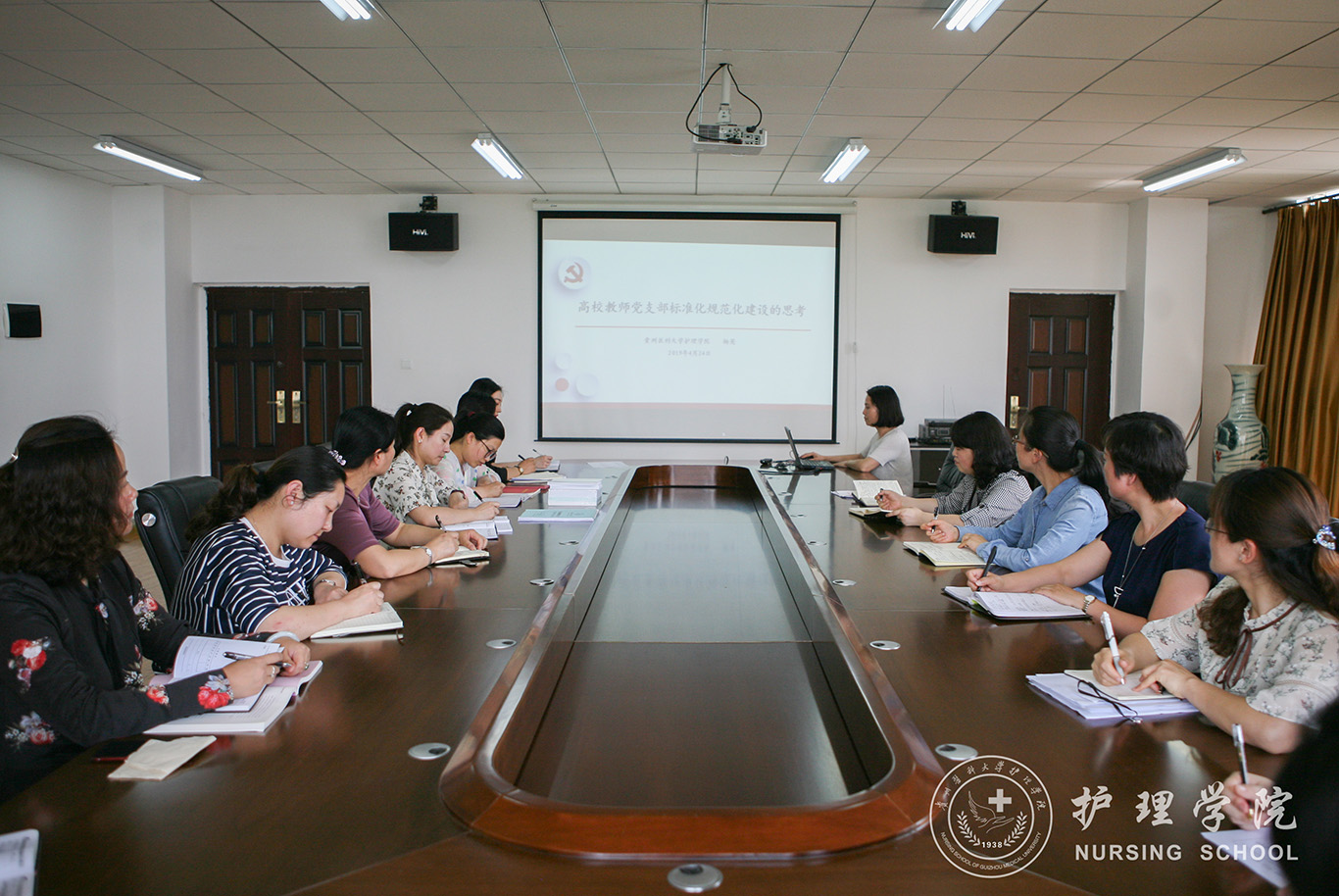 院党委书记杨英同志以《高校教师党支部标准化规范化建设的思考》为题,为支部党员讲述了一堂精彩的党课。杨英结合支部建设的新标准新要求,从“实施党支部标准化规范化建设的背景、党支部工作存在的主要问题及原因、解决问题的方法路径”三个方面为大家进行了讲授。