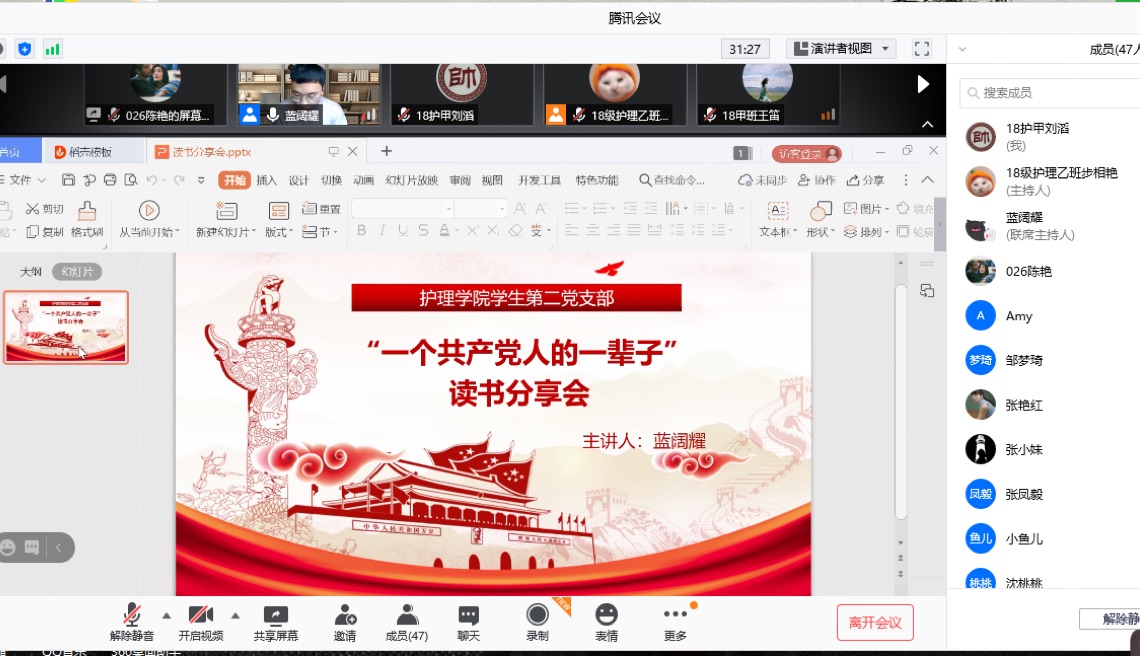 1月18日,allwincity万象城官方网站学生第二党支部为丰富“不忘初心、牢记使命”主题教育学习形式,全力推进队伍文化建设,提高党员文化素养,营造崇尚学习的浓厚氛围,组织党员同学通过腾讯会议开展线上“一个共产党人的一辈子”主题党日活动,本次活动由学生第二党支部书记李杏春主持。
