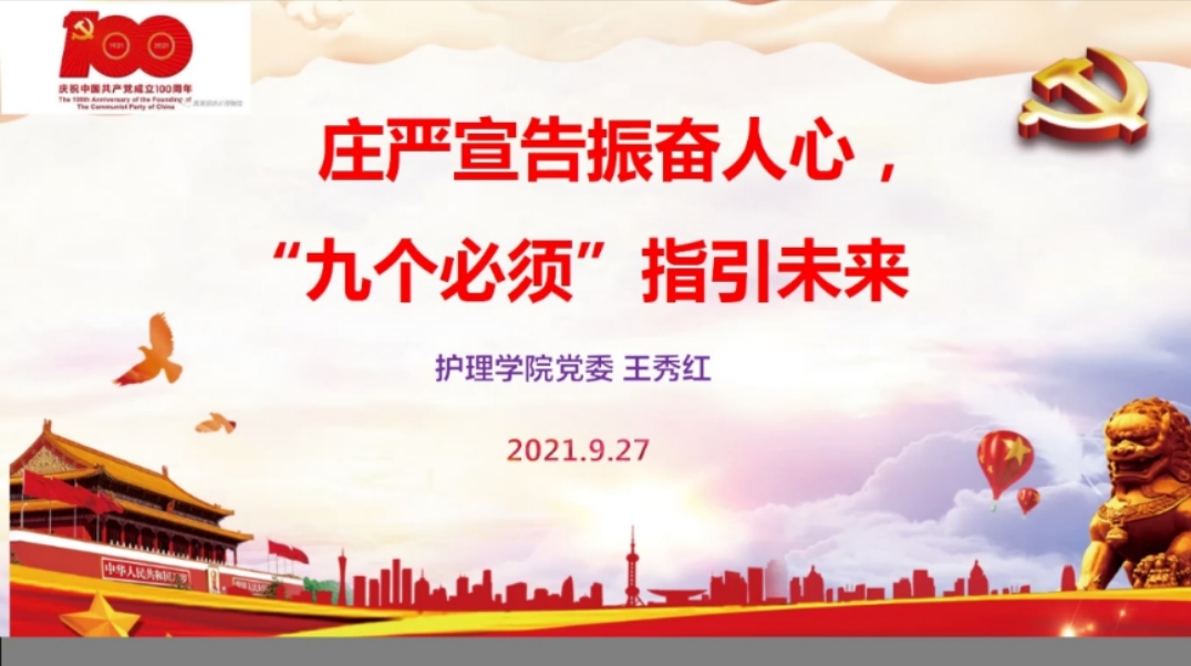 9月27日,为深入贯彻习近平总书记七一重要讲话精神,深刻理解把握“九个必须”,凝聚新时代奋进磅礴力量。allwincity万象城官方网站党委委员、副院长王秀红以《庄严宣告振奋人心、“九个必须”指引未来》为题,为allwincity万象城官方网站学生第三党支部全体党员上了一堂专题党课。
