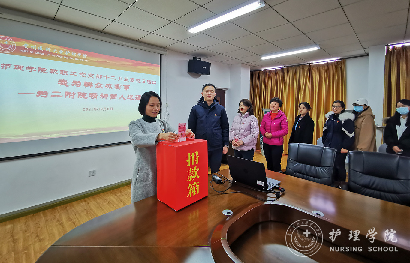 本次主题党日活动分为两个部分。第一项是开展“我为群众办实事”——送温暖活动。学院教职工党支部在了解到第二附属医院精神科部分病人因为没有监护人缺乏过冬衣物后,组织教职工党员积极捐款捐物帮助该科室解决问题。经统计,共计捐款3850元及衣物若干,所捐款项将用于为困难精神病人购买冬鞋。
