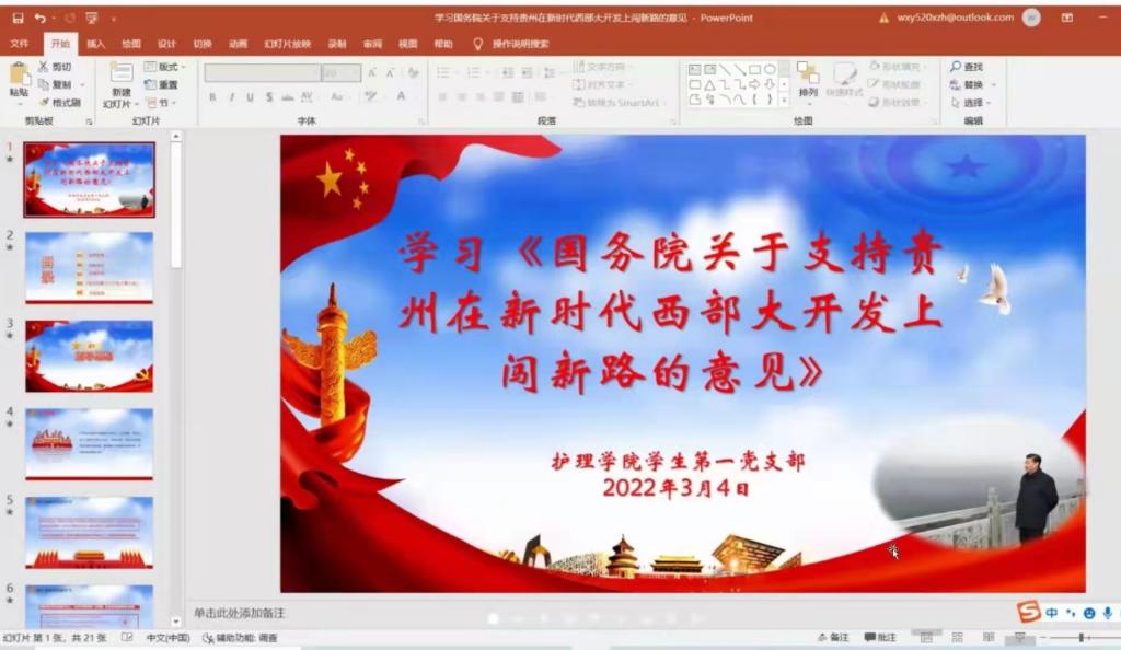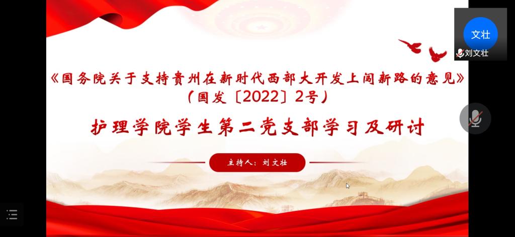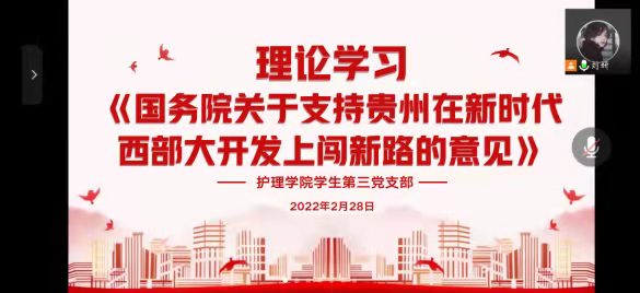 2月28日至3月7日,allwincity万象城官方网站三个学生党支部在腾讯会议开展了关于《国务院关于支持贵州在新时代西部大开发上闯新路的意见》(以下简称《意见》)的学习及研讨。学生第一党支部书记杨叶卿、学生第二党支部书记刘文壮、学生第三党支部书记刘妍分别主持会议,各支部党员参会。