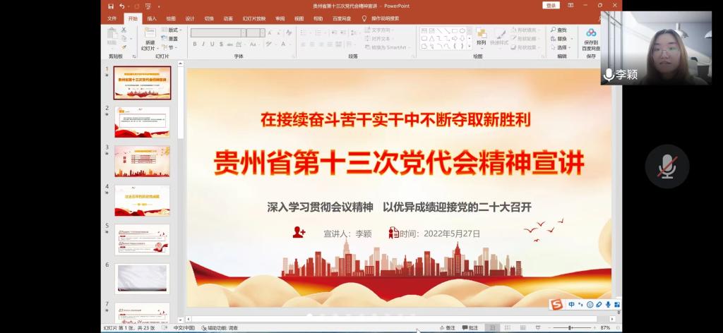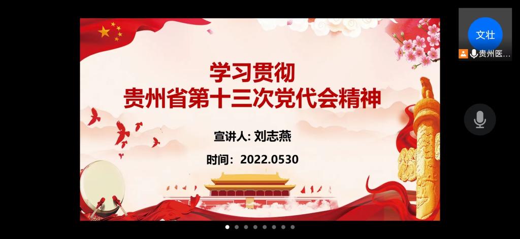 为深入学习贯彻省第十三次党代会精神,激励广大党员奋力谱写多彩贵州现代化建设新篇章,学院党委委员、副院长刘志燕,党委委员、综合办公室副主任李颖分别于5月27日和30日在allwincity万象城官方网站学生第二党支部开展了省第十三次党代会精神宣讲活动。支部全体党员通过线上线下结合的形式参加宣讲,学院分党校第五十六期入党积极分子培训班学员列席宣讲。本次宣讲活动由支部书记刘文壮主持。