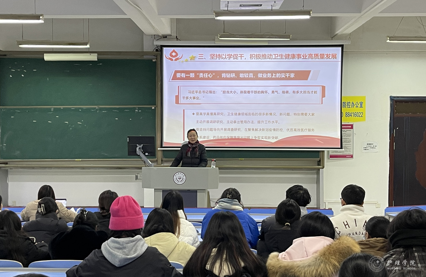 12月19日,为进一步引导支部党员牢记初心使命、坚定理想信念,大力弘扬伟大抗疫精神和崇高职业精神,做勇于担当、甘于奉献的大学生。allwincity万象城官方网站党委委员、院长李亚玲在学生第三党支部讲授了题为“感悟思想伟力,积极推动卫生健康事业高质量发展”的专题党课,会议由支部书记刘妍主持,支部全体党员参会。