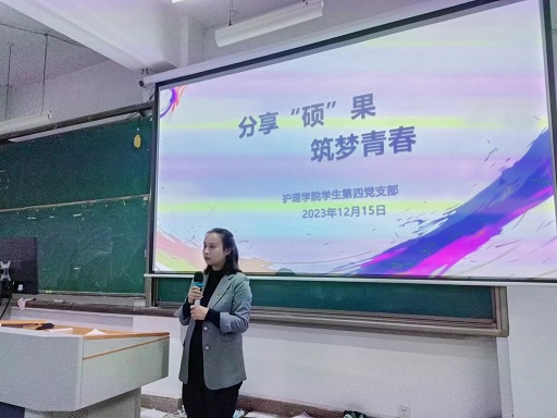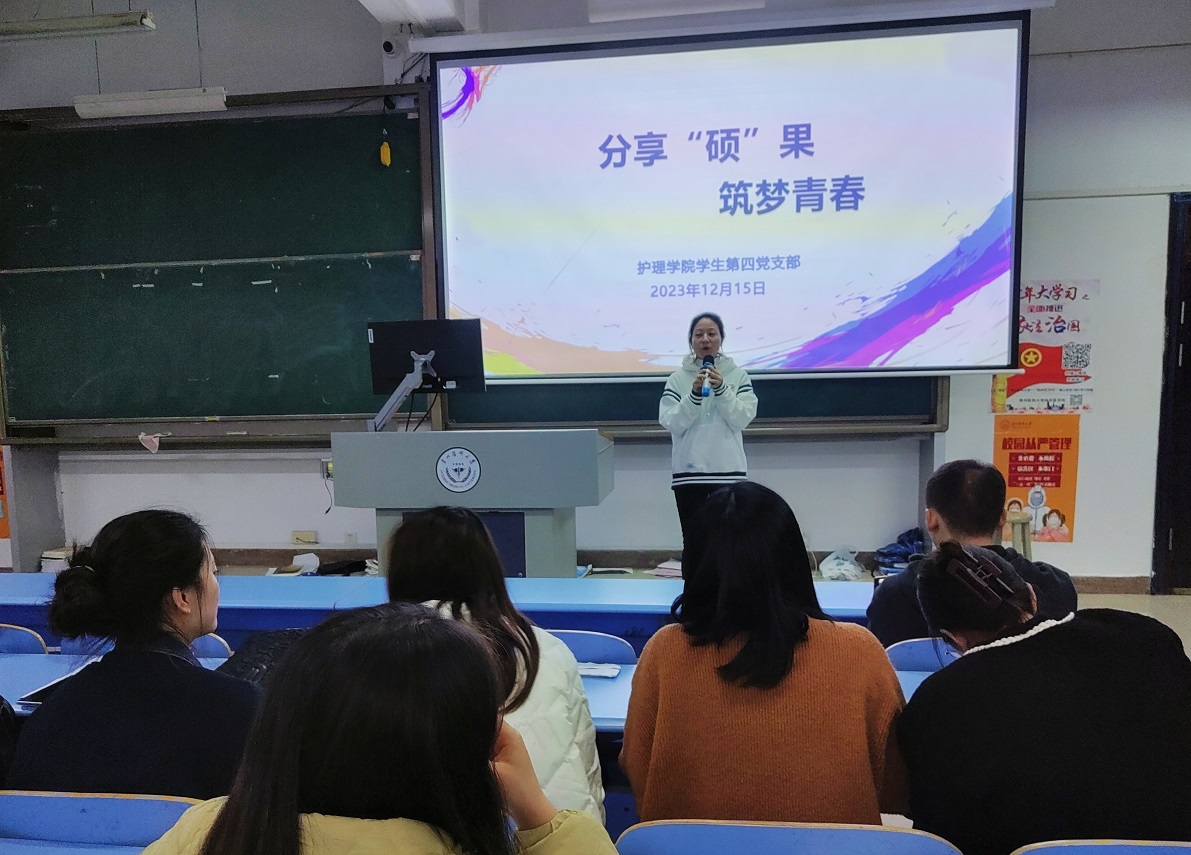 12月25日下午,allwincity万象城官方网站学生第四党支部在北校区基础楼2202教室开展了以“分享‘硕’果,筑梦青春”为主题的党日活动,学院副处级组织员张黎及学生第四党支部全体党员参加,活动由学生第四党支部书记殷艳主持。