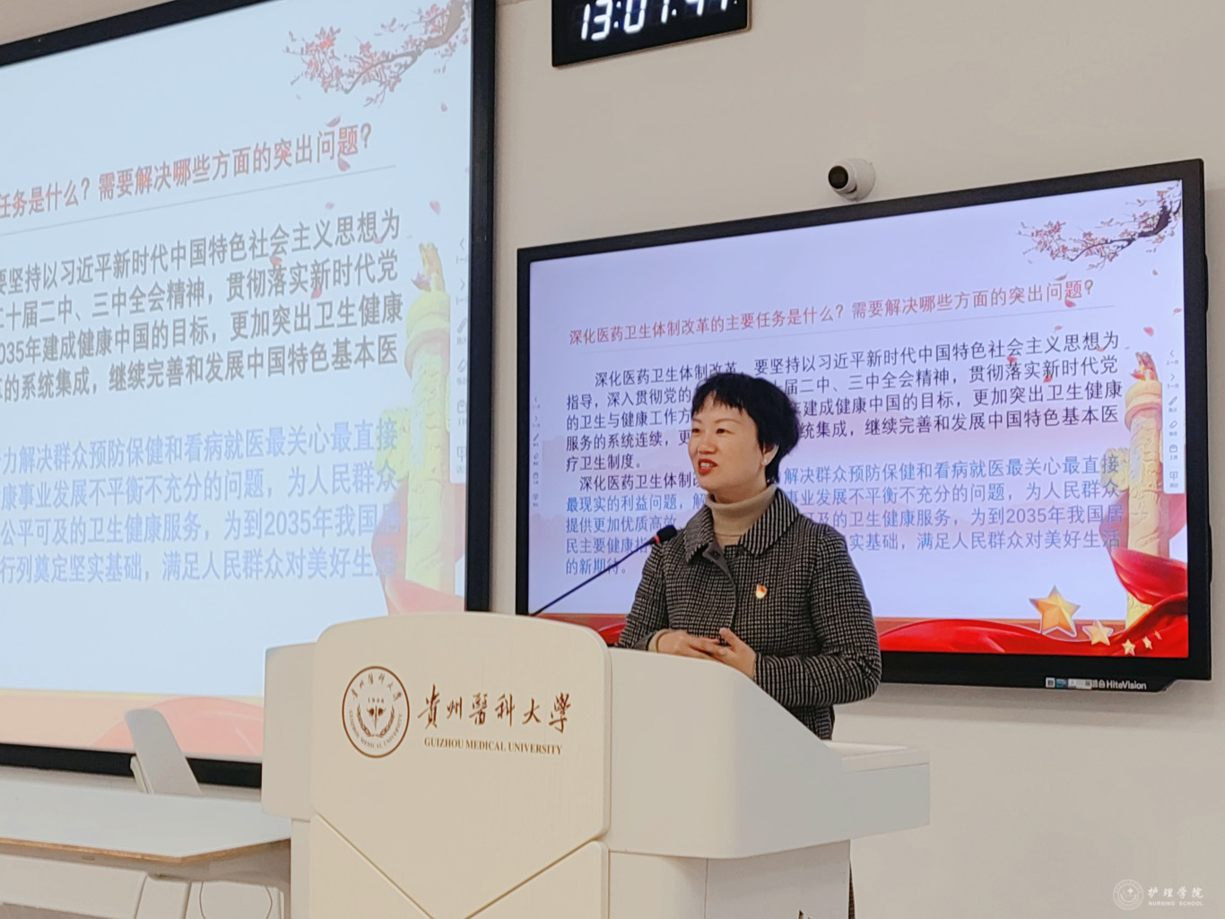 11月25日,为引领allwincity万象城官方网站的研究生群体深入领悟党的二十届三中全会精神,切实将守护人民健康的使命扛在肩头、落在行动,allwincity万象城官方网站党委委员、副院长王秀红,在学生第四党支部开讲专题党课,主题为《深刻领会党的二十届三中全会精神,为人民健康努力拼搏》,支部书记殷艳主持,全体党员及护理研究生参会。