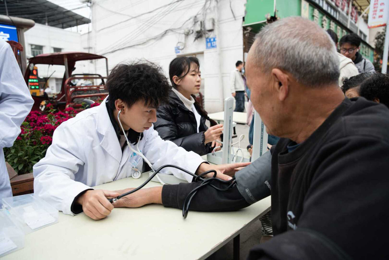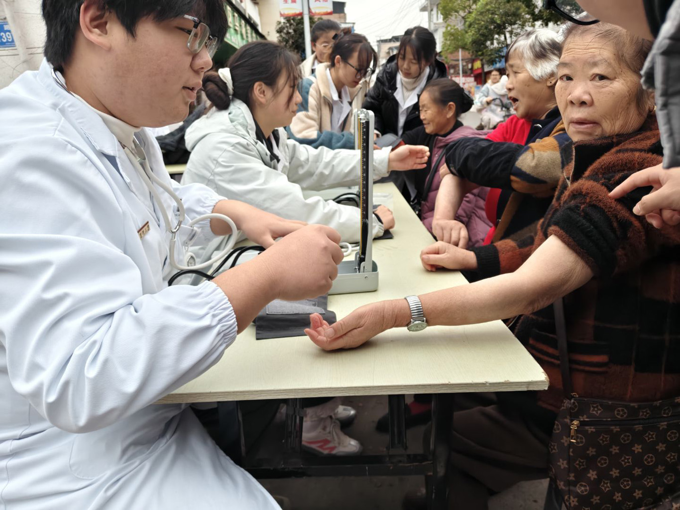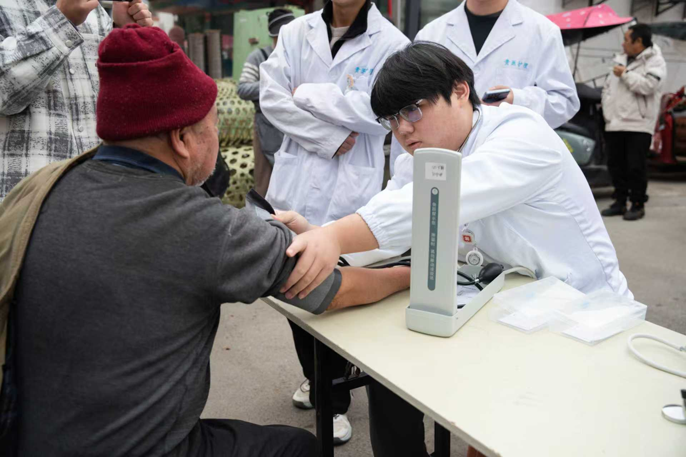 活动过程中,志愿者们悉心为马场镇上的老年人们提供了免费的血压测量服务,并针对每位老人的身体状况开展了个性化的健康知识讲解,志愿者们耐心回应老人们关于常见疾病防治的各类疑问,用扎实的专业知识和良好的人文关怀素养为保障老年人身体健康及日常生活质量奉献了暖心的青春力量。