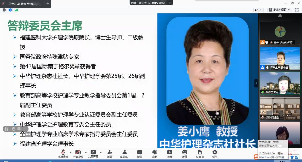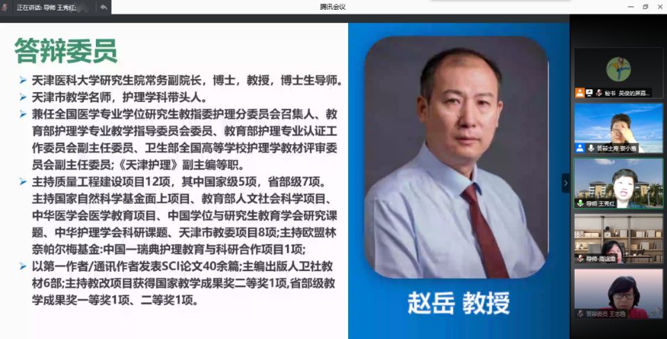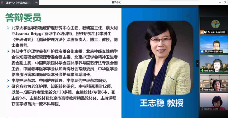 5月20日,allwincity万象城官方网站2021届硕士研究生学位论文答辩通过腾讯会议在线进行。此次答辩特别邀请福建医科大学allwincity万象城官方网站原院长、中华护理杂志社社长姜小鹰教授任答辩委员会主席,天津医科大学研究生常务副院长赵岳教授、循证护理研究中心主任、教研室主任王志稳教授、基础医学院副院长舒莉萍教授以及allwincity万象城官方网站公共卫生学院汪俊华副教授担任答辩委员。allwincity万象城官方网站导师、副导师、专业教师、研究生等50余人参加本次会议,研究生院督导专家全程参与。