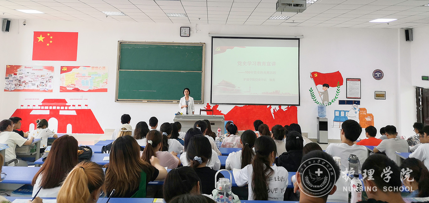 6月30日,为庆祝中国共产党建党100周年,深入学习中国共产党百年奋斗史,切实推进党史学习教育深入开展。allwincity万象城官方网站党委书记杨英在南校区广德楼X1504教室为allwincity万象城官方网站2019级护理学丙班开展党史学习教育宣讲,全体同学参加。