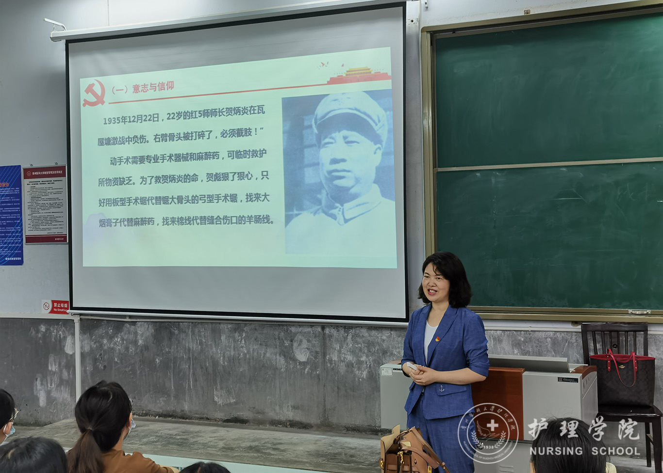 会中,刘志燕以“传承红色基因,推进护理人才高质量发展”为题,从意志与信仰、责任与奉献两个方面为学生党员分享贺炳炎、彭绍辉、程根思、邱少云等革命先烈们感人至深、意义重大的党史故事,每个故事都蕴藏着对党的赞美与热爱,先烈们英勇非凡、舍己为人的伟岸形象深深感染了在场的每一位党员。紧接着,刘志燕为党员们介绍新时代干部党性修养的三个“底色” ,即忠诚、干净、担当,强调忠诚是为政之魂,干净是立身之本,担当是成事之要,为全体党员讲述了一堂生动形象、涤荡思想与灵魂的党课。最后,刘志燕用先烈们浴血奋战的精神,激励全体党员努力学好专业知识和专业技能,在国家召唤人民需要的时候,能够站得出来,冲得上去,担当起救死扶伤、为民服务的历史重任,体现护理人的专业价值和使命担当。