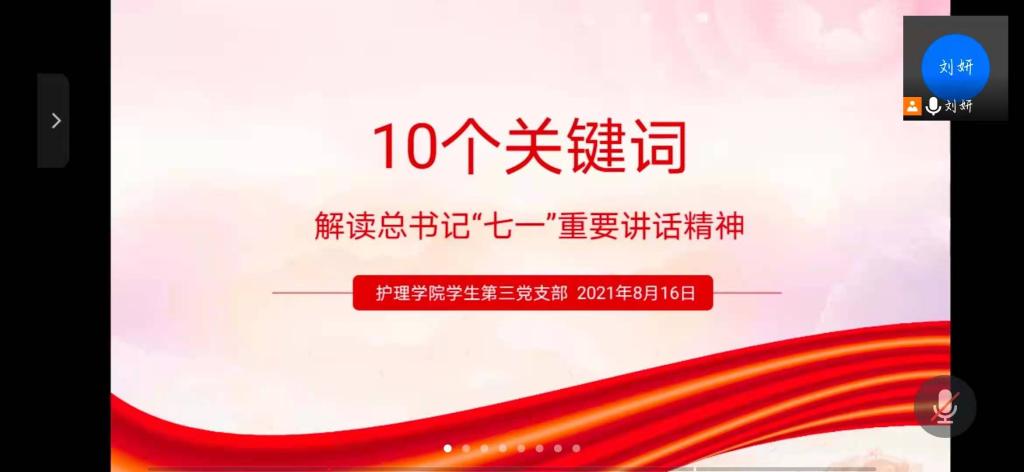 8月16日,为深入学习贯彻习近平总书记“七一”重要讲话精神,从党的百年奋斗历程中汲取奋进力量,引导新时代中国青年深刻领会和准确把握重要讲话精神的重大意义、丰富内涵,切实把思想和行动统一到讲话精神上来。allwincity万象城官方网站学生第三党支部开展了习近平总书记“七一”重要讲话精神专题宣讲会,由allwincity万象城官方网站学生第三党支部书记刘妍主讲,支部全体党员和入党积极分子参会。