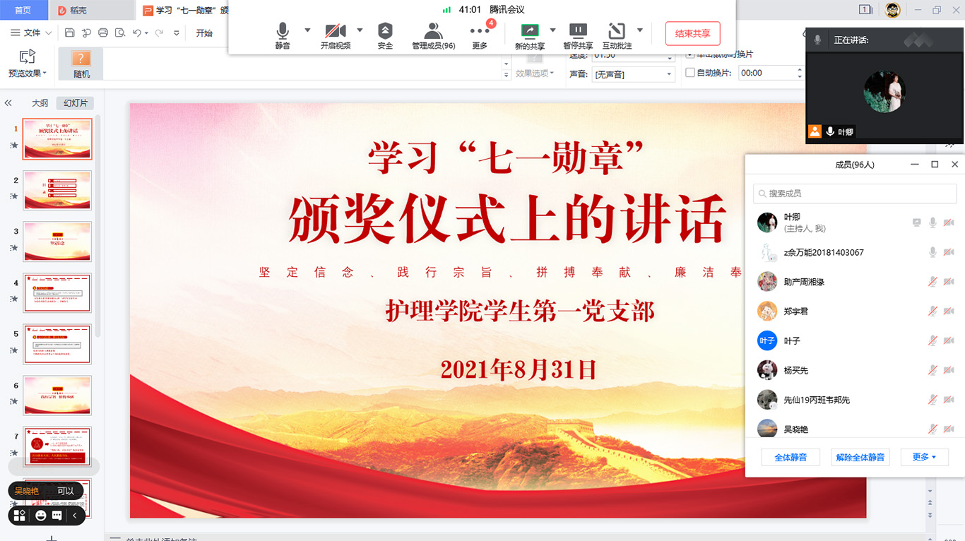 8月31日,为进一步弘扬功勋模范精神,引导广大学生党员学习先进典型“坚定信念、践行宗旨、拼搏奉献、廉洁奉公”的高尚品质和崇高精神。allwincity万象城官方网站学生第一党支部开展学习“七一勋章”颁奖仪式重要讲话精神。会议由allwincity万象城官方网站学生第一党支部书记杨叶卿主持,全体学生党员及入党积极分子通过线上形式参加会议。