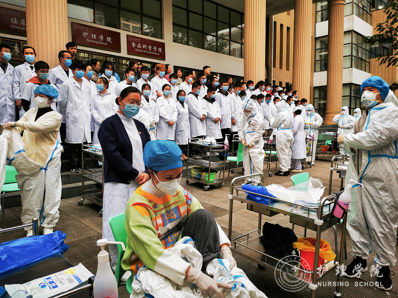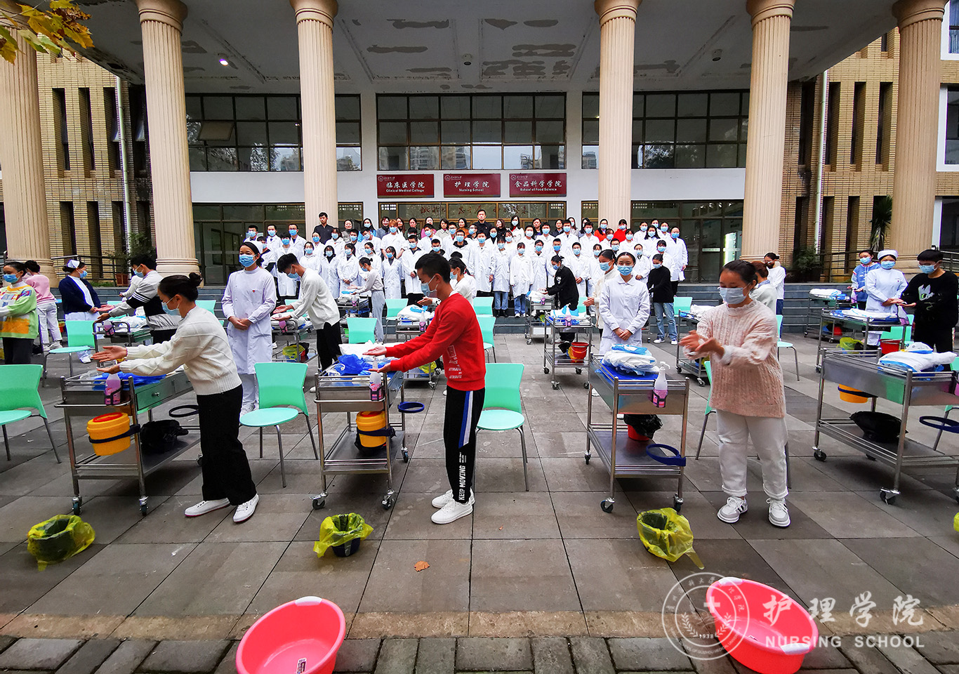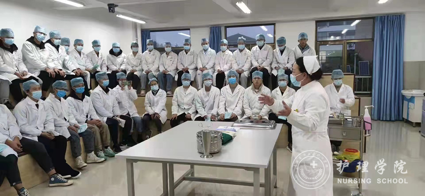 百川楼1楼小操场上,整齐摆放着30台治疗车,学生教练员早已准备就绪,随着老师一声令下,学生教练员开始现场演示如何正确穿脱防护服,他们个个认真、细心、严谨,展示了娴熟的操作技能。穿脱防护服演示结束后,万象城官网基础护理学教研室的资深教师、学生最喜爱的肖霓老师,在百川楼三楼allwincity万象城官方网站示教室为协和班的同学进行了一场无菌操作示教活动,本次示教活动采取理论和实践相结合,生动形象的将无菌操作技术展现在同学们眼前,同学们均表示收获满满。最后,在获得防疫相关理论知识的基础上,allwincity万象城官方网站的30名学生教练员在模拟实验室开始对协和班的同学就如何正确穿脱防护服和采取咽拭子进行“一对一”指导和考核。