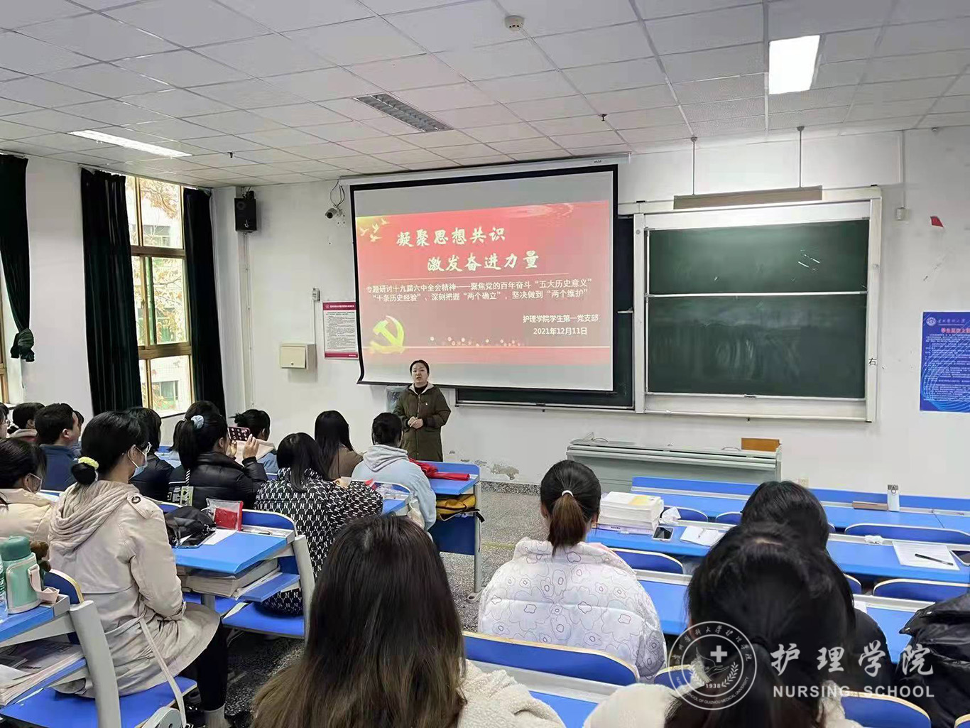 首先,杨叶卿以“党的十九届六中全会精神”为纲,全面、深入、系统地讲解党的百年奋斗“五大历史意义”、“十条历史经验”、深刻把握“两个确立”、坚决做到“两个维护”。并要求全体学生党员要切实把思想和行动统一到党的十九届六中全会精神上来,要把全会精神内化于心,外化于行,转化为奋进新征程、建功新时代的强大动力。