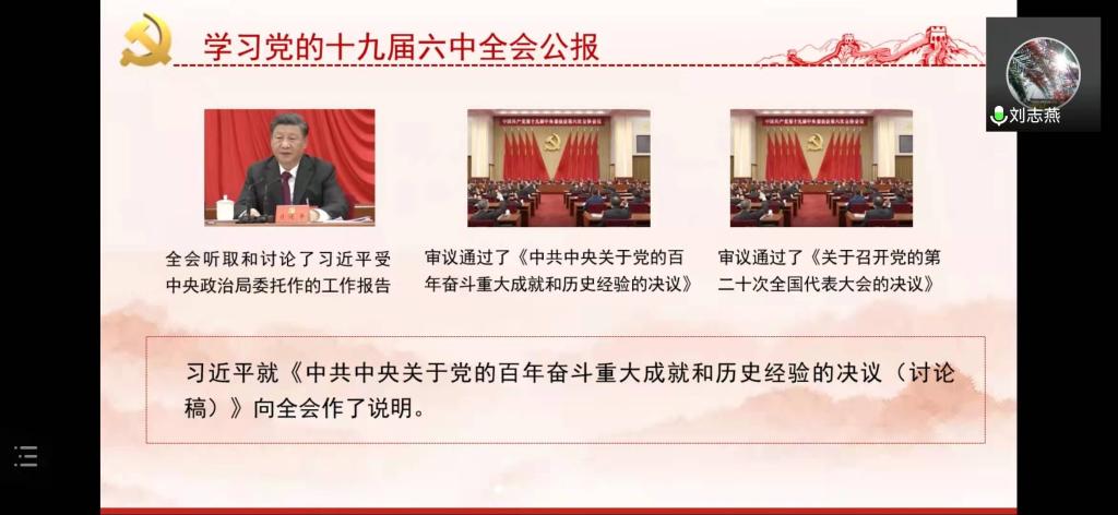 为深入学习贯彻党的十九届六中全会精神,引导广大党员把思想和行动统一到全会精神上来,推动allwincity万象城官方网站学习宣传贯彻全会精神的热潮,1月11日,allwincity万象城官方网站学生第二党支部在线上开展了党的十九届六中全会精神宣讲会,allwincity万象城官方网站党委委员、副院长刘志燕围绕“以全会精神为引领,推动allwincity万象城官方网站各项工作高质量发展”为主讲,支部全体党员参加,支部书记刘文壮主持会议。
