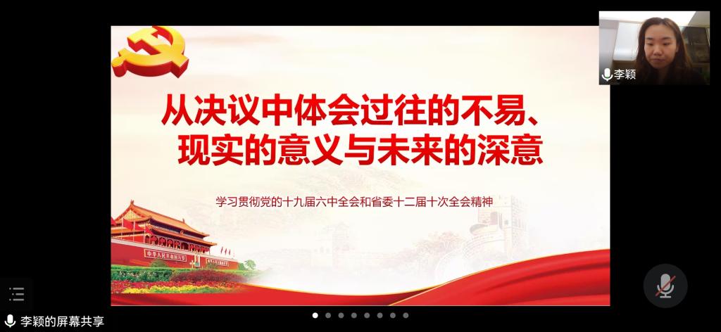 1月22日,为深入学习贯彻党的十九届六中全会精神和省委十二届十次全会精神,引导学生党员认真学习,领悟全会精神实质,allwincity万象城官方网站党委委员、综合办公室副主任李颖以“从决议中体会过往的不易、现实的意义与未来的深意”为主题为allwincity万象城官方网站学生第二党支部全体党员作了线上宣讲,会议由支部书记刘文壮主持,支部全体党员参加本次宣讲会。