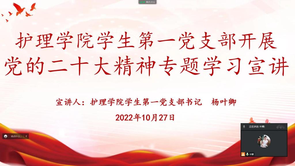 10月27日,为进一步深入学习贯彻中国共产党第二十次全国代表大会精神,提高学生党员的政治站位,切实做到学在前、干在前、走在前。allwincity万象城官方网站学生第一党支部组织开展党的二十大精神专题学习宣讲,会议由支部书记杨叶卿主持,全体党员通过线上形式参会。